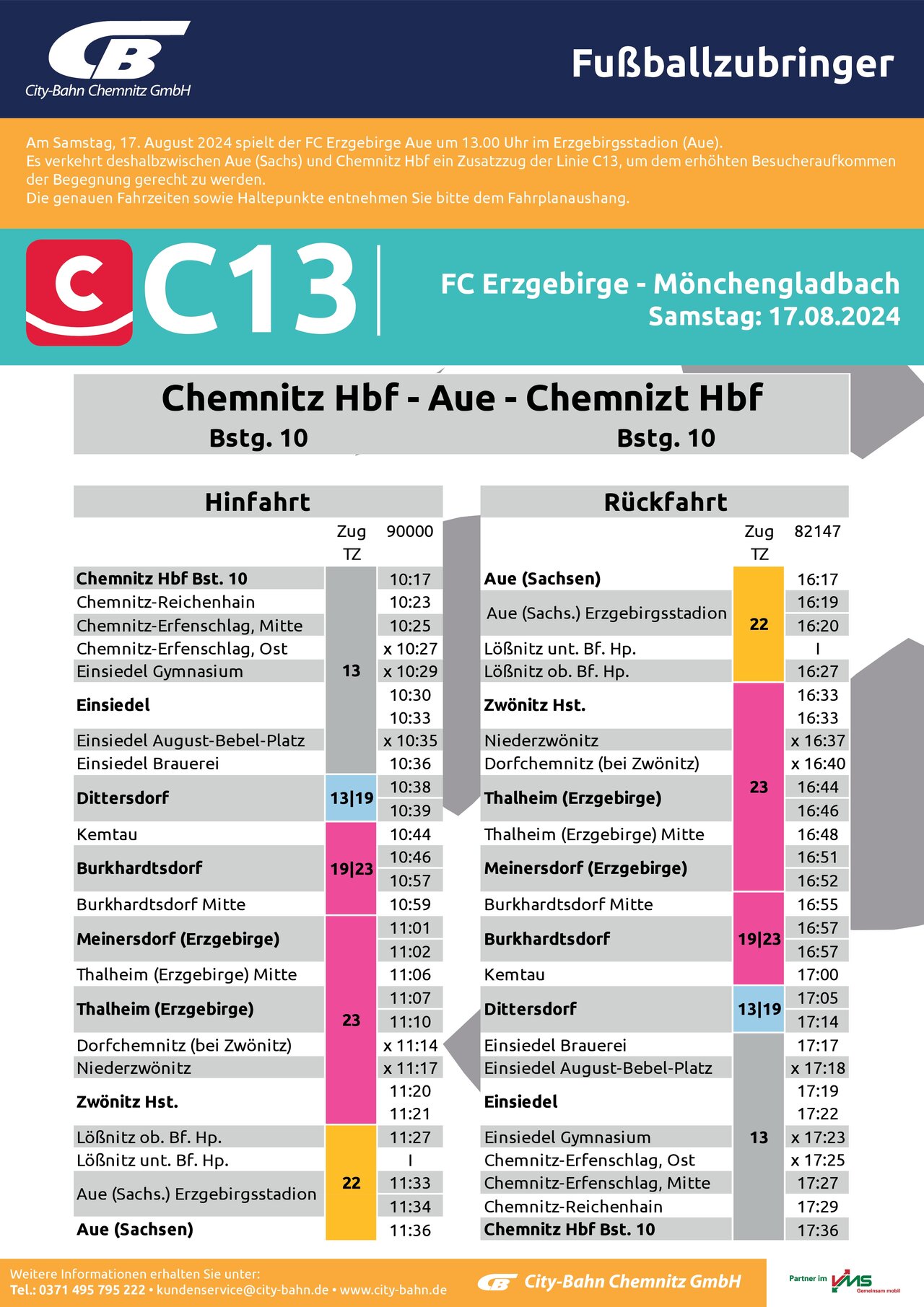 Zusätzlich zum Normalfahrplan verkehrt zwischen Aue (Sachs) <> Chemnitz Hbf ein Zusatzzug der Linie C13, um dem erhöhten Besucheraufkommen der Fußball-Begegnung FC Erzgebirge Aue – Borussia Mönchengladbach gerecht zu werden. Wir bitten anreisende Fans bei der An- und Heimreise nach Möglichkeit auf diese Verbindungen mit erhöhter Beförderungskapazität auszuweichen.
