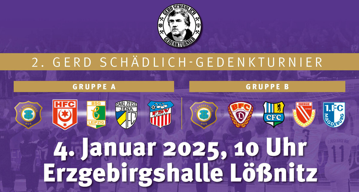 Das zweite Gerd Schädlich-Gedenkturnier am Sonnabend, 4. Januar 2025, ab 10 Uhr soll nahtlos an das Debüt anknüpfen. Bereits um 9.40 Uhr erfolgt die offizielle Begrüßung der Mannschaften in der Erzgebirgshalle Lößnitz. Die Jugendmannschaften freuen sich auf große Unterstützung von den Rängen. Rechtzeitiges Erscheinen sichert die besten Plätze. Lasst die Spiele beginnen!