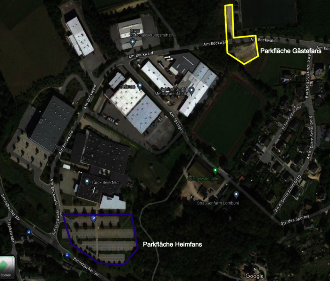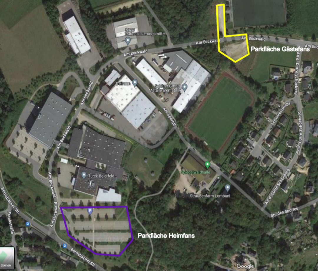 Für Fans des FCE ist der große Mitarbeiterparkplatz der Firma Turck reserviert. Von da aus sind es noch ca. 200 Meter bis zum Stadion.