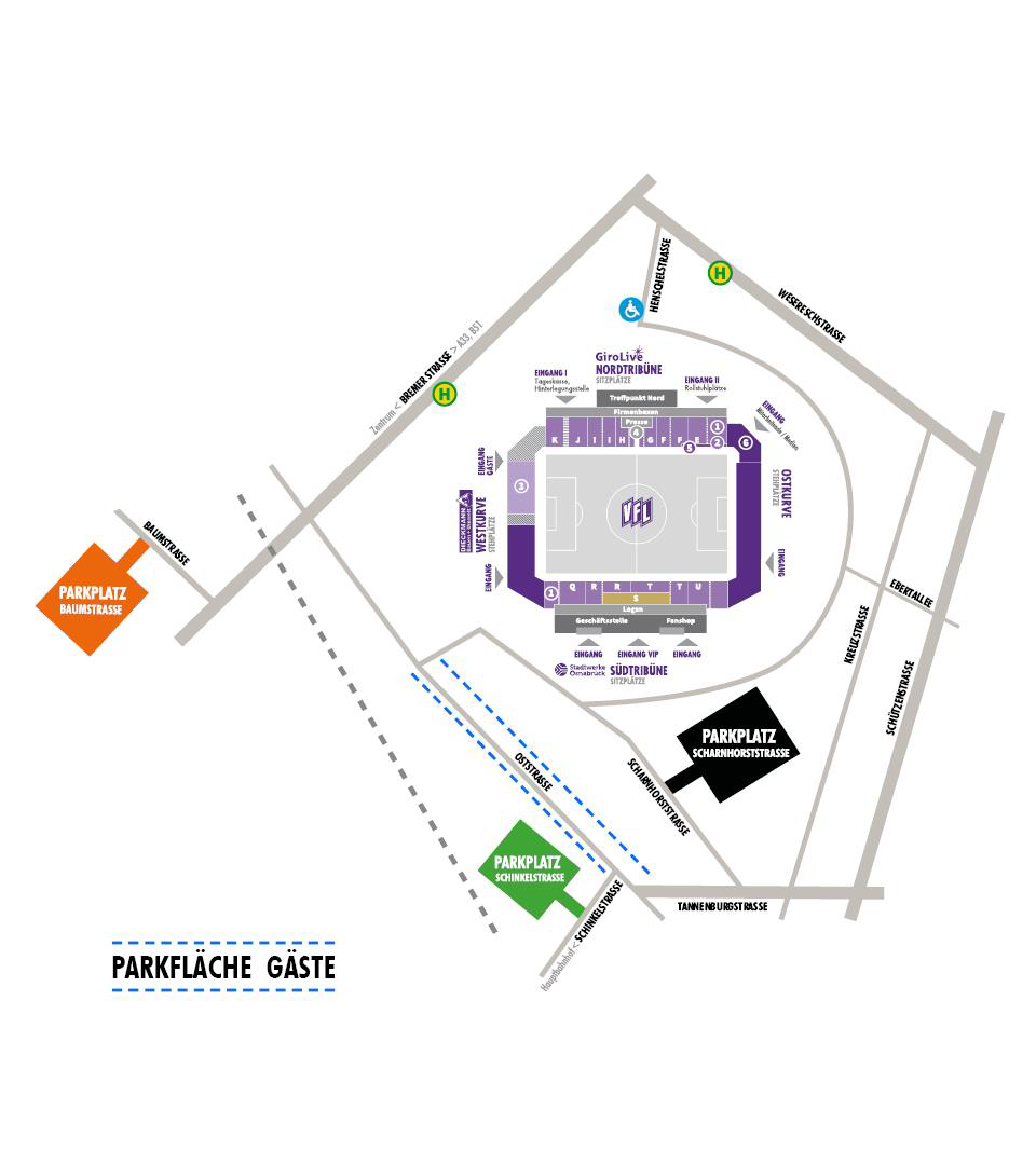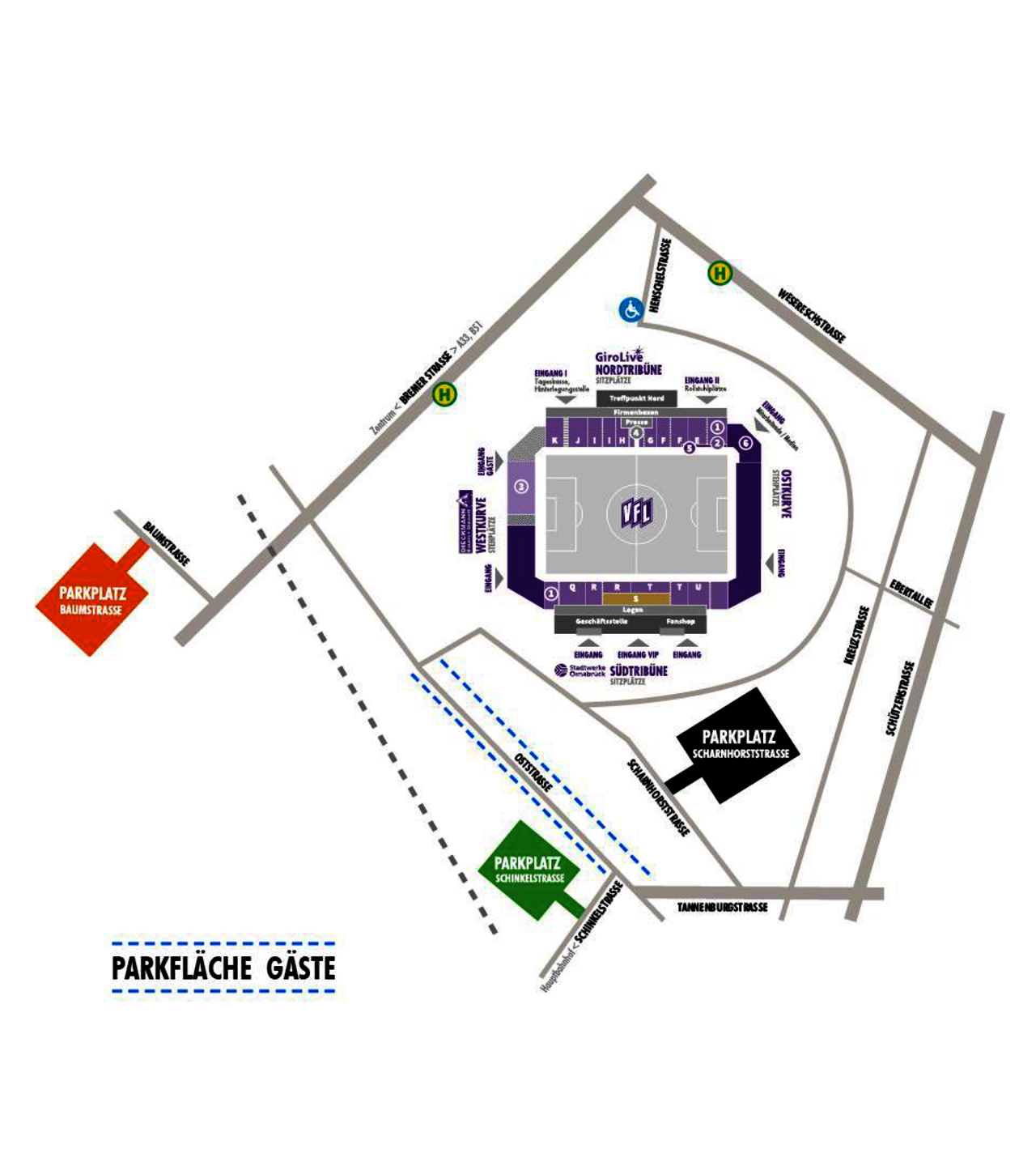 Weitere Parkplätze (u. a. Halle Gartlage) stehen nicht zur Verfügung bzw. werden nach dem Spiel aufgrund der Fantrennung nicht erreichbar sein