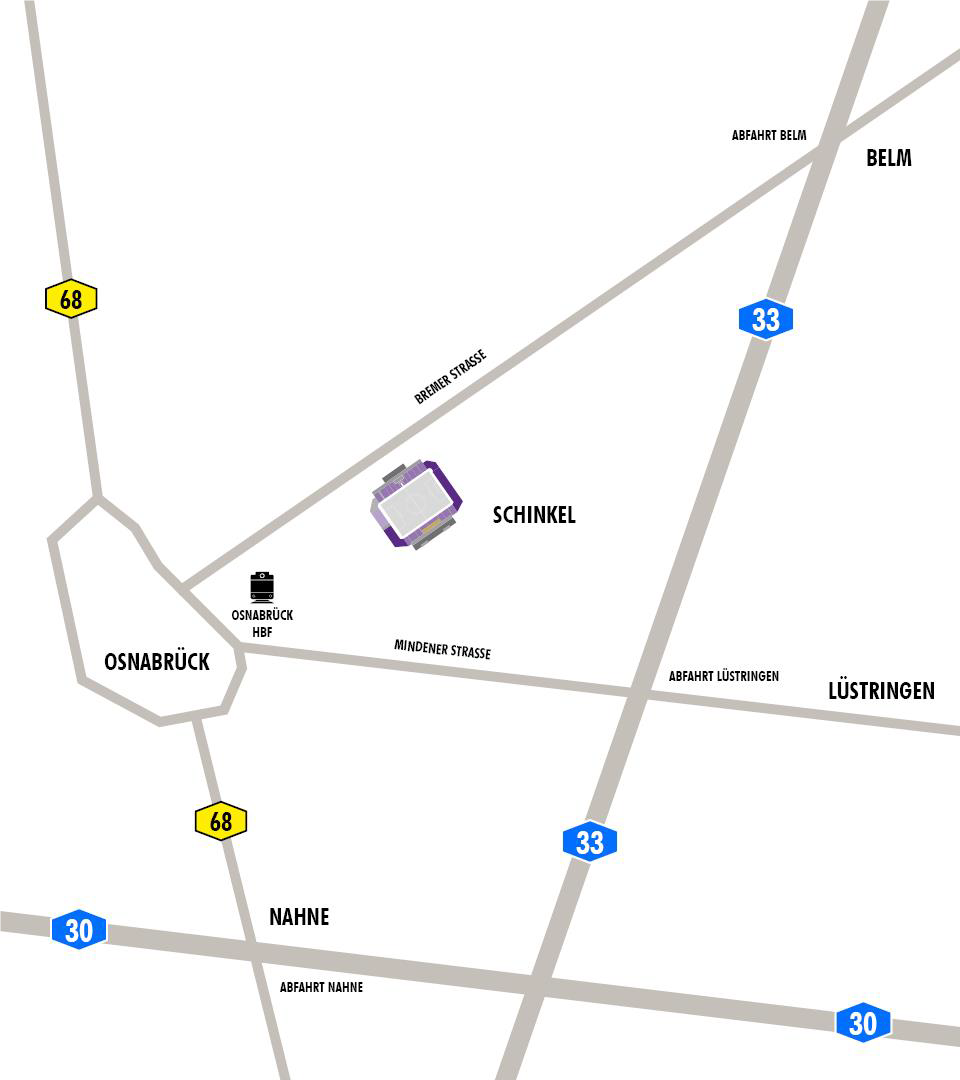 Anfahrt über die BAB 30 bis zum Autobahnkreuz Osnabrück Süd, von dort weiter auf BAB 33 Richtung Diepholz bis zur Abfahrt Osnabrück Lüstringen. Dort rechts auf die Mindener Straße abbiegen, weiter auf der Buerschen Straße fahren und dann rechts in die Oststraße/Gästeparkplatz einbiegen.