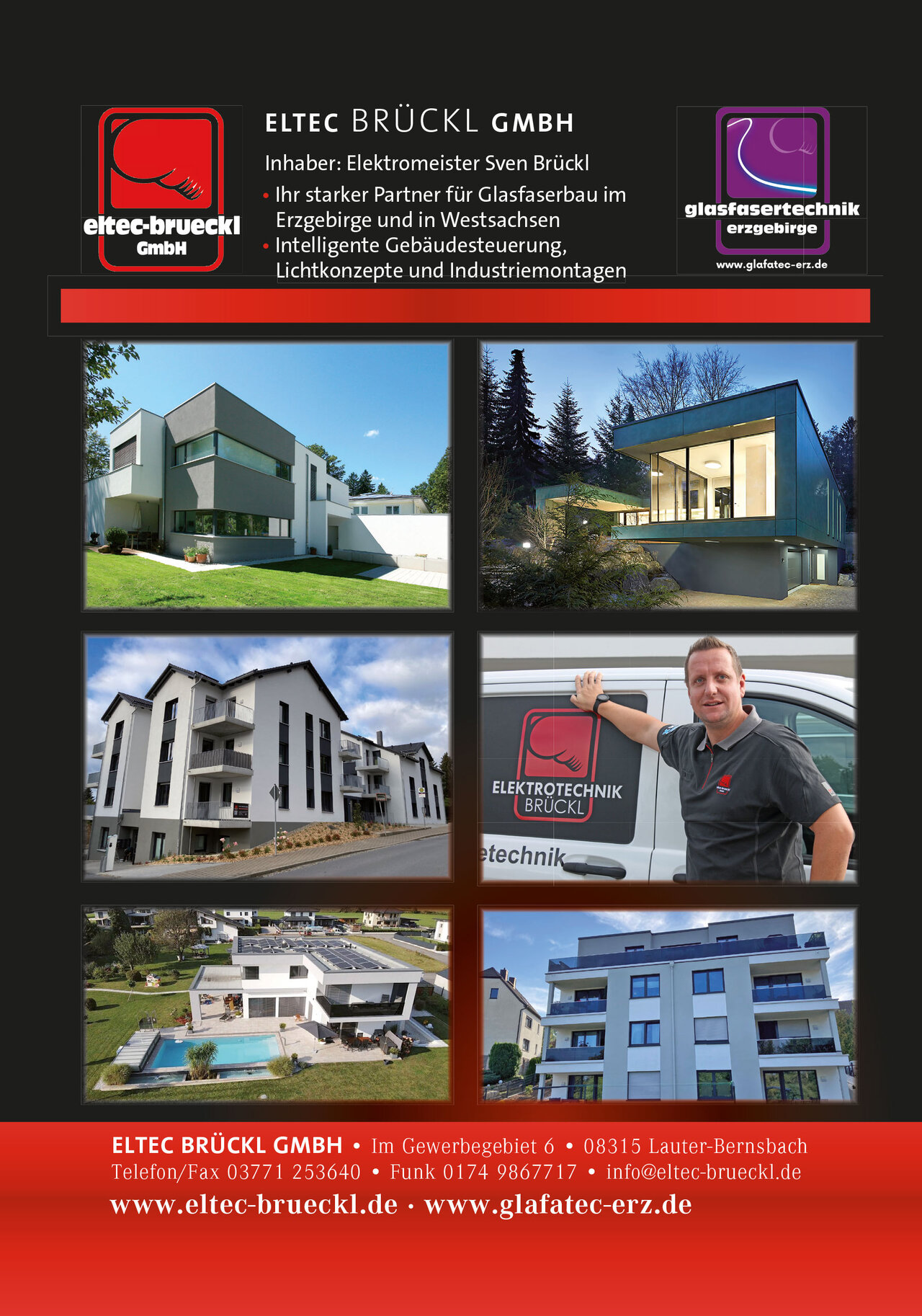 Gerade 23-jährig, gründete dieser 2005 sein Unternehmen mit einem Mitarbeiter in Aue, damals unter dem Namen Elektrotechnik Sven Brückl. Der Jungmeister ließ keine Chance aus, sein Unternehmen nach vorne bringen. So waren es 2015 schon zehn Mitarbeiter im damaligen Firmensitz „Blema Kircheis” in Aue. Heute ist sein 2016 umformiertes Unternehmen Eltec Brückl GmbH für Industrie und Handwerk, Bauträger, Wohnungsbaugenossenschaften sowie Privatkunden tätig, häufig als Komplettanbieter. Zum Profil zählen neben der klassischen Elektroinstallation auch Beleuchtungskonzepte und Netzwerktechnik sowie die intelligente „smarte” Gebäudetechnik. Das Markenzeichen sind stets individuelle Lösungen in bester Qualität.
