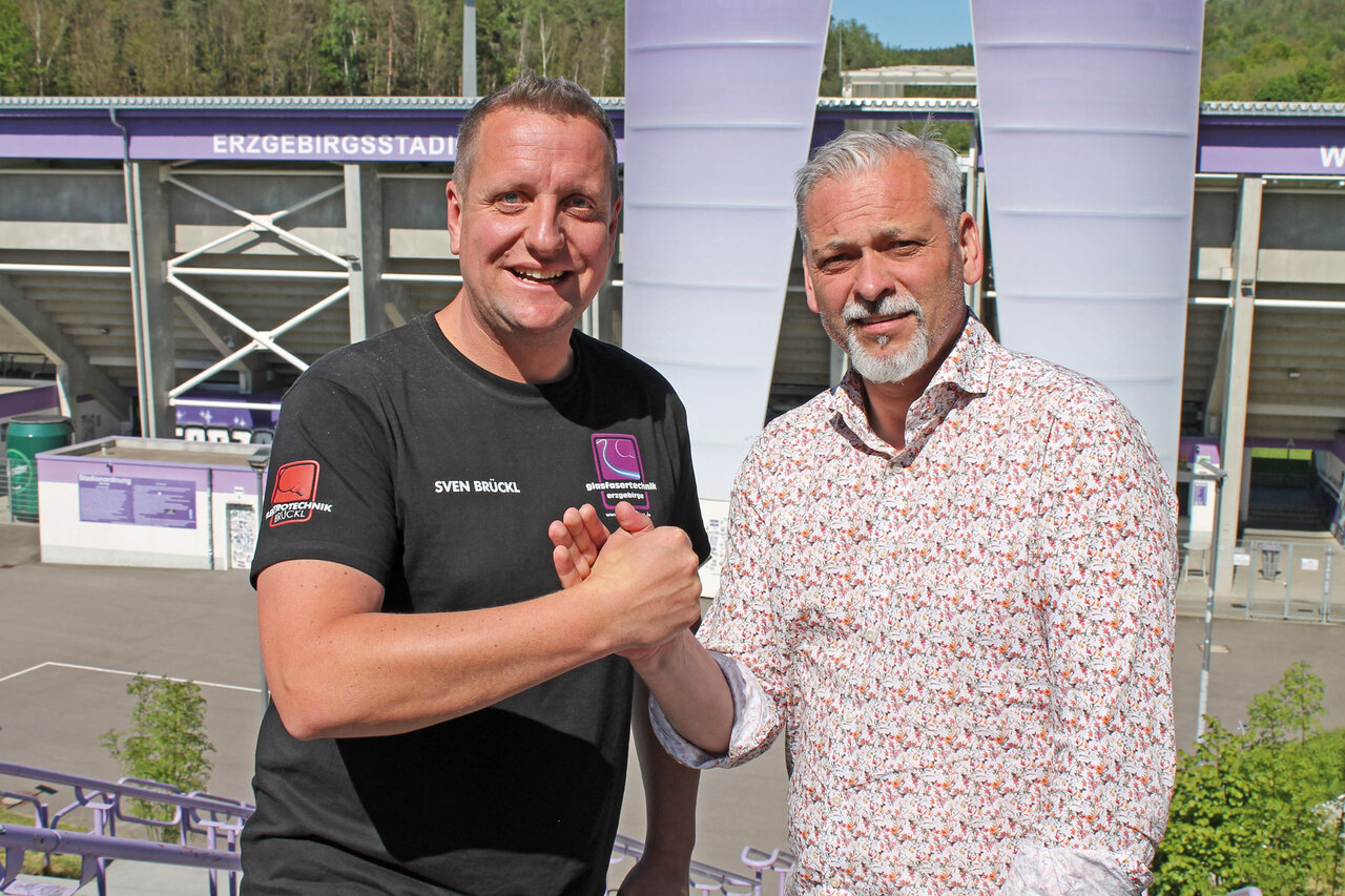 Seit vielen Jahren arbeitet das Brückl-Team für Kunden beziehungsweise bei Bauvorhaben mit Unternehmen zusammen, die Sven aus dem Sponsorenpool des FC Erzgebirge gut kennt „Wir konzentrieren uns auf Kunden in Südwestsachsen”, berichtet der Unternehmer und erwähnt gern, dass man seit 2010 Sponsor des Kumpelvereins ist. Am Dienstag dieser Woche besiegelte Sven mit FCEMarketingleiter Enrico Barth die Fortsetzung des Vertrages als Werbepartner für die neue Saison 2024/25. Im Erzgebirgsstadion hat die Firma auch nach dessen Fertigstellung gut zu tun: „Wir installierten die LED-Bandentechnik und Anzeigetafeln und betreuen sie weiter, das ist bei uns Chefsache. Bei jedem Heimspiel ist jemand von uns vor Ort, meist auch ich selber. Zudem zeichnete Eltec Brückl für die Elektrotechnik in den VIP-Räumen, der Geschäftsstelle, im Internat, im Fanshop und weiteren FCE-Bereichen verantwortlich.” Eltec Brückl ist auf der E-Strecke Dienstleistungspartner des Kumpelvereins.