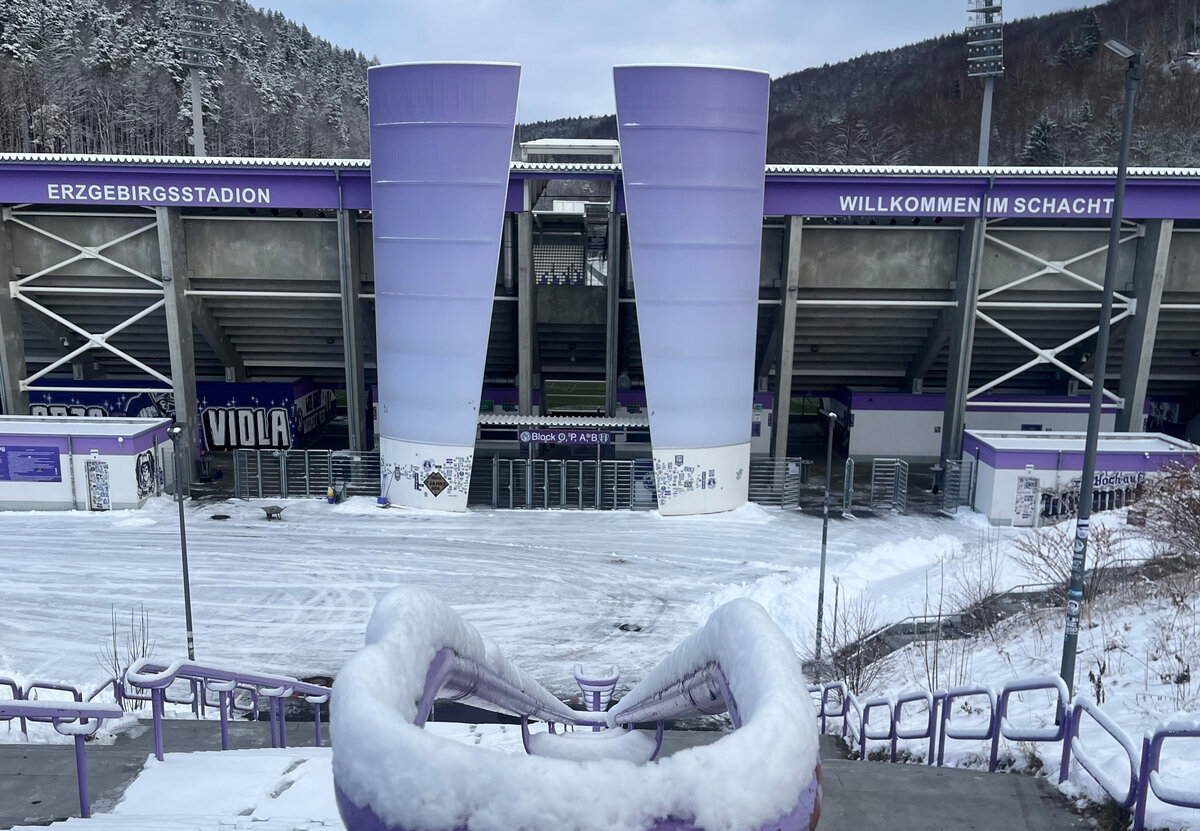 Nach heftigem Niederschlag am Donnerstag hat der FCE nichts unversucht gelassen, das erste Heimspiel des neuen Jahres nicht zu gefährden. Bereits am Freitagvormittag kam bei strahlendem Sonnenschein „grüne Licht“. Es ist Winter im Erzgebirge. Doch das macht dem Club nichts aus. Im Gegenteil. Das ist unser Wetter! Die Mannschaft stellte sich mit einem Aktivierungstraining um 10.30 Uhr bereits auf die Bedingungen ein. Um 19 Uhr ertönt der Anpfiff zur Partie zweier Traditionsvereine.
