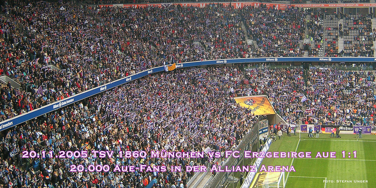 Am 20. November 2005 fand in der blau angestrahlten Allianz-Arena das Zweitliga-Duell zwischen dem TSV 1860 München und dem FC Erzgebirge Aue statt. Unter den 51.700 Zuschauern befanden sich auch sagenhafte 20.000 Anhänger des FC Erzgebirge Aue, die die Reise in die bayerische Metropole angetreten hatten. 1:1 endete die Partie, die Konstellation FCE gegen 1860 steht nun erneut auf dem Programm: Beim letzten Spiel des Jahres 2024 hat Aue am 21. Dezember 2024 um 14 Uhr Heimrecht.