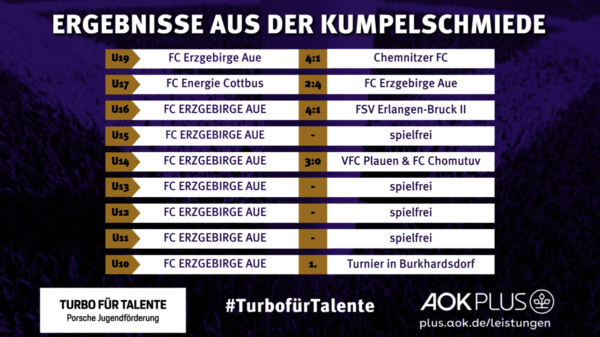 U17: Der 4:2-Erfolf gegen Bundesligist Energie Cottbus war durchaus überraschend. Insgesamt war es ein sehr guter und überzeugender Auftritt der Auer Mannschaft, vor allem spielerisch. Zudem war der FCE sehr robust in den Zweikämpfen und konnte sich in vielen Aktionen behaupten. Die erste Halbzeit stach dabei besonders hervor, da die Veilchen viele gute Möglichkeiten herausspielen konnten. In der zweiten Hälfte nutzte Aue die Möglichkeiten übers Umschalten und Standards. Auch aus dem Spiel heraus blieben die lila-weißen B-Junioren stets gefährlich. Die Treffer zum 4:2-Sieg erzielten Ben Hilpert, Emil Schneider, Anton Vulturius und Hugo Kaps.