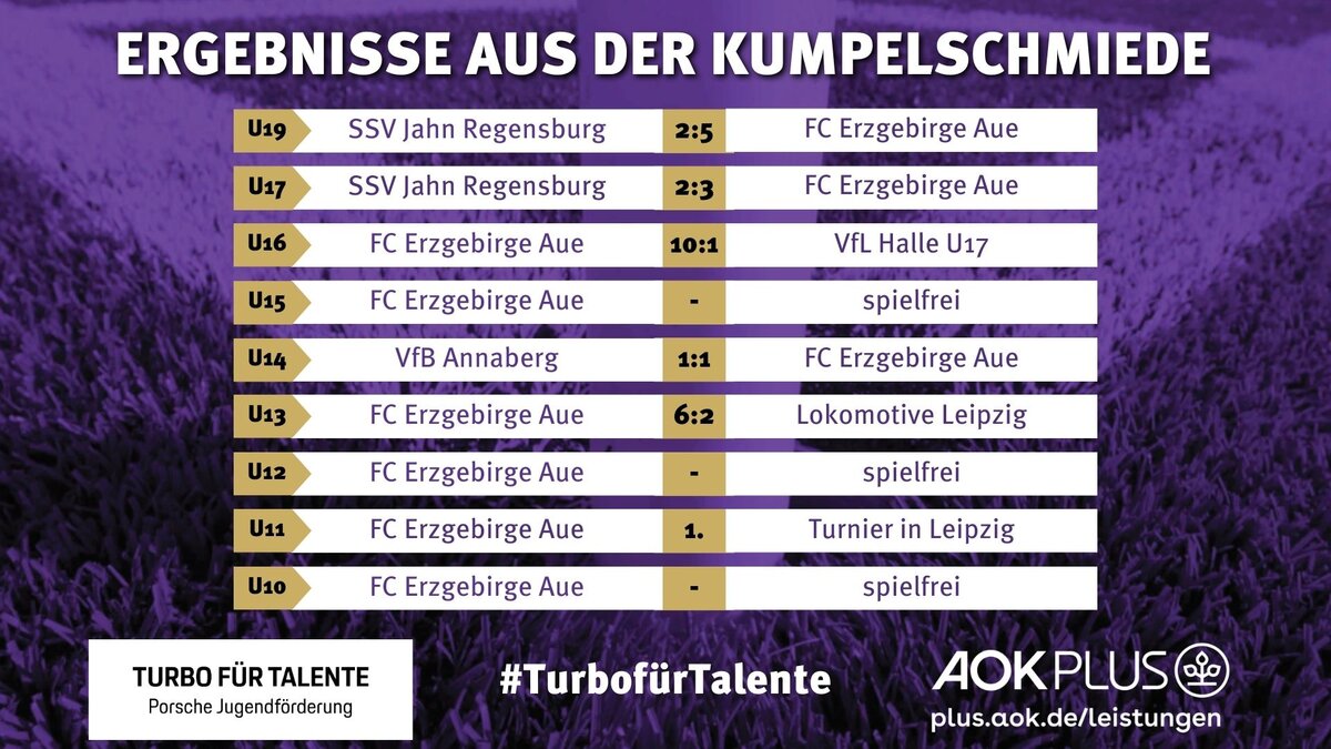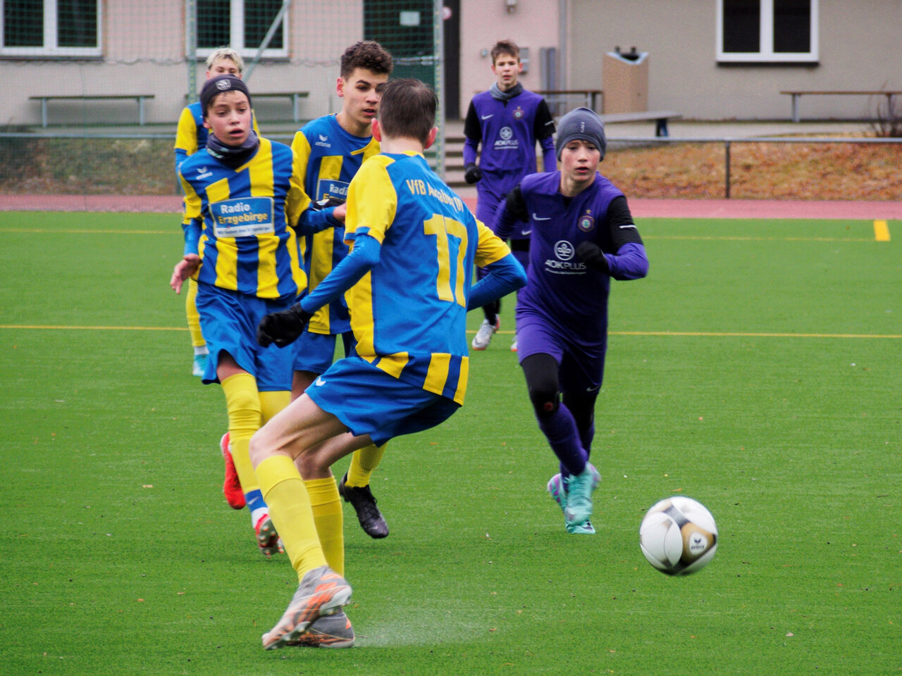 Die U11 des FC Erzgebirge Aue kehrte mit dem Siegerpokal vom sehr gut besetzten Hallenturnier des 1.FC Lok Leipzig zurück. Auf dem Kunstrasen der Trainingshalle hatte der FCE nur zu Beginn einige Mühe in Tritt zu kommen, verlor zum Auftakt 2:3 gegen Carl Zeiss Jena. Die restlichen Gruppenspiele gegen Fortuna Chemnitz, Lok II und Chemie Leipzig gewannen die Veilchen jedoch hoch und wurden damit Staffelsieger wegen des besseren Torverhältnisses. Im Halbfinale ließen die E-Junioren den Gleichaltrigen vom FSV Zwickau beim 6:1 keine Chance. Im Endspiel gegen Lok Leipzig ließ Aue mehrere Chancen aus, machte es unnötig spannend und holte sich mit dem 2:1-Finalsieg verdient die Trophäe. Die U11 wusste mit mannschaftlicher Geschlossenheit zu überzeugen und holte als beste Mannschaft des Turniers verdient Platz 1 im letzten Hallenauftritt des Winters.