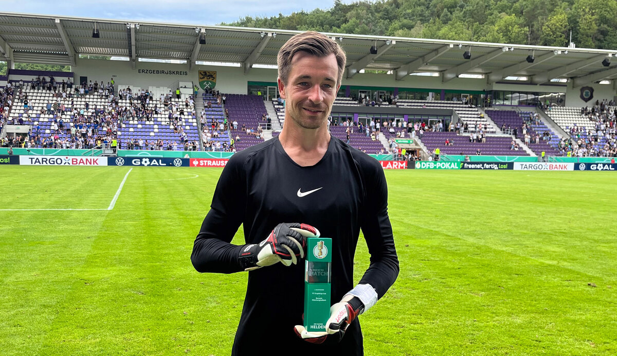 Glücklich sah Martin Männel nicht aus, als er von Sky-Reporter Karsten Petrzika die Trophäe für die Auszeichnung „Man of the Match“ entgegennahm und anschließend auch die Glückwünsche der DFB-Delegation. Gern hätte er die individuelle Ehrung gegen einen mannschaftlichen Erfolg eingetauscht. Aber das verdiente Lob steht sinnbildlich für eine gute Leistung des FCE-Teams gegen einen insgesamt etwas besseren Bundesligisten.