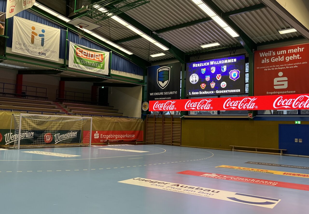 Vor hoffentlich großer Kulisse – 2000 Zuschauer passen in die stimmungsvolle Arena – wird es nach dem Einmarsch der Mannschaften nostalgisch. Denn beim Gedenkturnier wird natürlich an Club-Legende Gerd Schädlich erinnert, ein entsprechender Film des MDR mit Statements von Jürgen Klopp und Marco Kurth wird über die Leinwände in der Halle abgespielt. Für das leibliche Wohl des Publikums ist auch gesorgt, die Eltern der U14-Kicker sind sogar mit einem Kuchenbasar am Start.