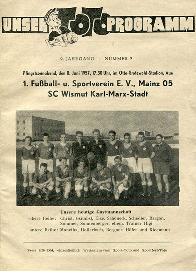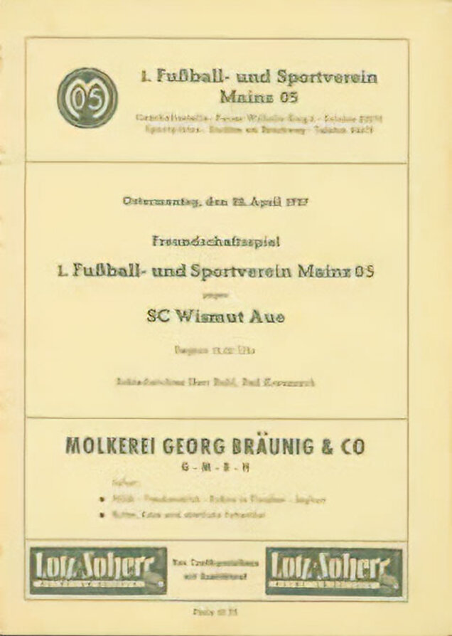 Zwei Tage später, am Ostermontag, trat der SC Wismut beim 1. FSV Mainz 05 in dessen Bruchwegstadion an. Der Verein nahm zwar an jeder Saison von 1945/46 bis 1962/63 in der Oberliga Südwest teil, stand aber auch nur viermal (1953, 1954, 1958 und 1961) in der oberen Tabellenhälfte und musste häufig um den Klassenerhalt fürchten. Nur in der ersten halben Stunde wusste Wismut an jenem 22. April 1957 durch geschicktes Stellungsspiel und sauberes Teamwork zu gefallen. Armin Günther brachte die Gäste in der 9. Minute in Front. Danach stellten sich die Nullfünfer besser auf das Kurzpassspiel der Gäste aus Sachsen ein. Im gleichen Maße verstärkte Mainz den Druck und vergab vor der Pause die Ausgleichschance durch einen vergebenen Elfmeter von Bergner. Dieser gelang dann jedoch unmittelbar nach dem Seitenwechsel durch Lothar Buchmann. (Der spätere bekannte Fußballtrainer betreute in der Bundesliga von 1978 bis 1985 die Vereine Darmstadt 98, VfB Stuttgart, Eintracht Frankfurt, Kickers Offenbach und den Karlsruher SC. Mit Eintracht Frankfurt gewann er 1981 den DFB-Pokal.) Danach erlaubte die Wismut-Abwehr dem schussunsicheren Mainzer Angriff keinen Treffer mehr. Dafür köpfte Linksaußen Siegfried Kaiser einen halbhohen Eckball in unnachahmlicher Art zum Siegestreffer zehn Minuten vor Spielende ein. 5.000 Zuschauer sahen dieses Freundschaftsmatch in Mainz. Die Nullfünfer hatten in der Saison 1956/57 zu Hause am Bruchweg einen Zuschauerschnitt von 3.880 pro Spiel.