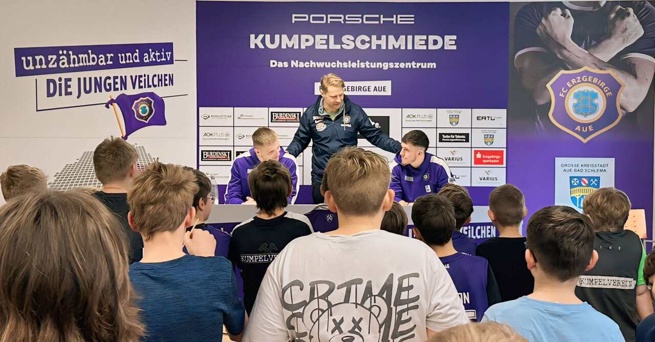 Ein Tag im Erzgebirgsstadion – 40 Kinder erlebten beim Porsche Kids Day ein unvergessliches Stadionerlebnis. Nach der Begrüßung durch Carsten Müller, Leiter der Porsche Kumpelschmiede, und Falk Schindler, Leiter der Veilchencamps, startete der sportliche Teil für die kleinen Fußball-Fans, die über die Aktion Kinderherzen, den Kinder- und Jugendnotdienst des SFZ Förderzentrum gGmbH und den Verein Bad Schlema am Porsche Kids Day teilnahmen. Im Nachwuchsleistungszentrum hatten sie die Möglichkeit, ihr fußballerisches Können unter Beweis zu stellen und verschiede Spielformen auszuprobieren.
