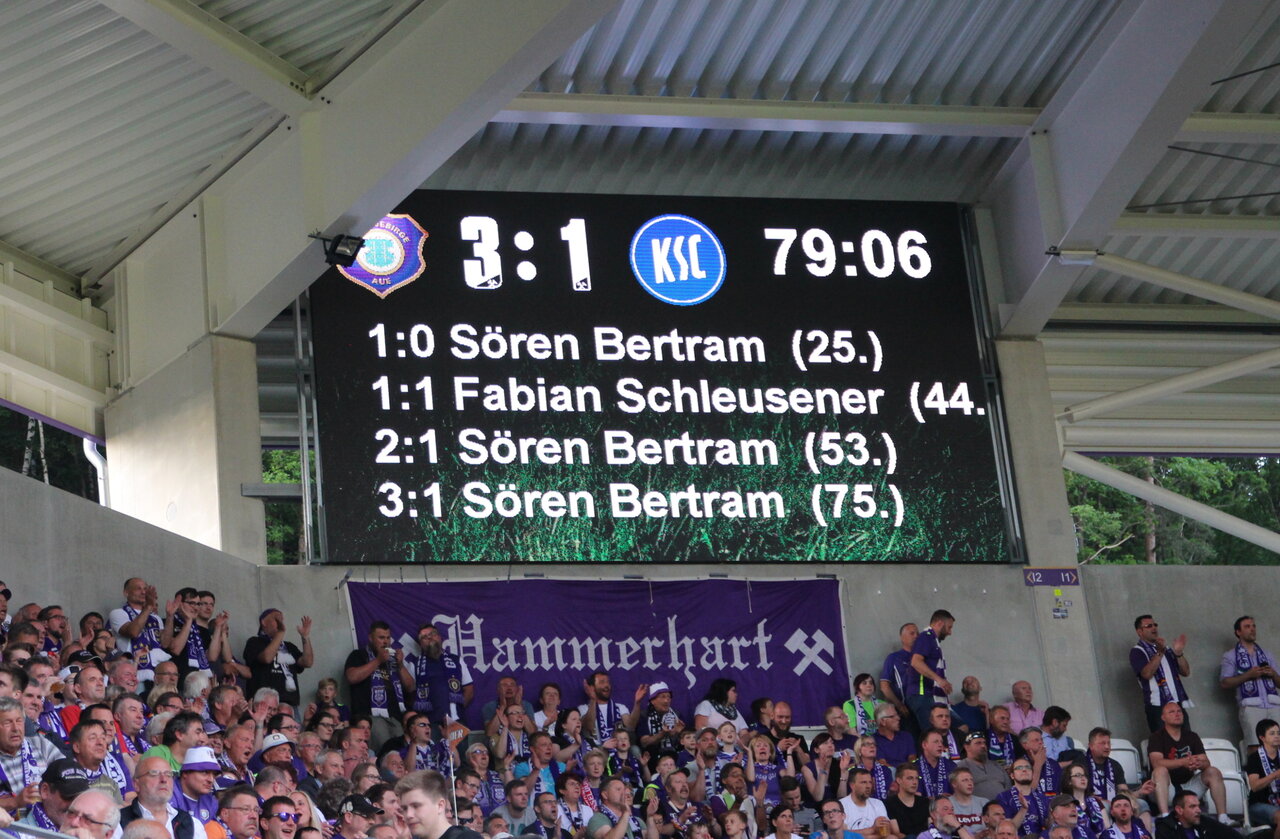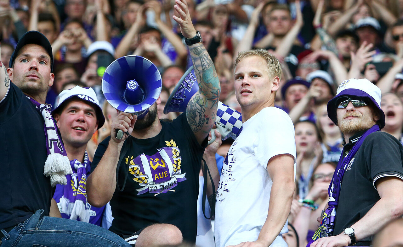 Dankbar ist Sören Bertram noch heute, dass der FCE ihn 2016 trotz Kreuzbandriss verpflichtete. Zwar hatte er beim Halleschen FC eine super Saison gespielt, sich dann aber schwer verletzt. „Aue hat mich trotzdem geholt und mir die nötige Zeit gegeben“, weiß Sören Bertram immer noch zu schätzen. Er kämpfte sich zurück und erlebte seinen ganz persönlichen Karriere-Höhepunkt im Erzgebirgsstadion. Am 22. Mai 2018 gewannen die Veilchen nach einem 0:0 im Hinspiel vor heimischem Publikum 3:1 gegen den Karlsruher SC und schafften den Klassenerhalt in der 2. Bundesliga. Dreifacher Torschütze an diesem historischen Tag beim FCE: Sören Bertram. „Wir waren damals eine coole Truppe mit Martin Männel, Philipp Riese, Clemens Fandrich und Steve Breitkreuz“, blickt der Triple-Schütze zurück.