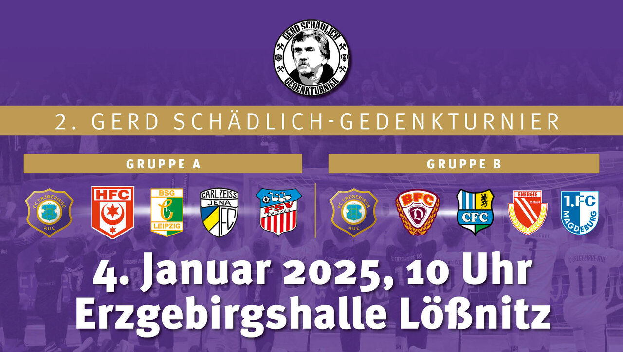 Bei der Erstauflage mit fantastischer Stimmung vor 1000 Zuschauern hatten sich die C-Junioren des FCE Team lila gegen Cottbus im Endspiel durchgesetzt und Siegerpokal entgegengenommen. Das zweite Gerd Schädlich-Gedenkturnier am Sonntag, 4. Januar 2025, ab 10 Uhr soll nahtlos an das Debüt anknüpfen. Bereits um 9.40 Uhr erfolgt die offizielle Begrüßung der Mannschaften in der Erzgebirgshalle Lößnitz. Die Jugendmannschaften freuen sich bereits auf große Unterstützung von den Rängen.