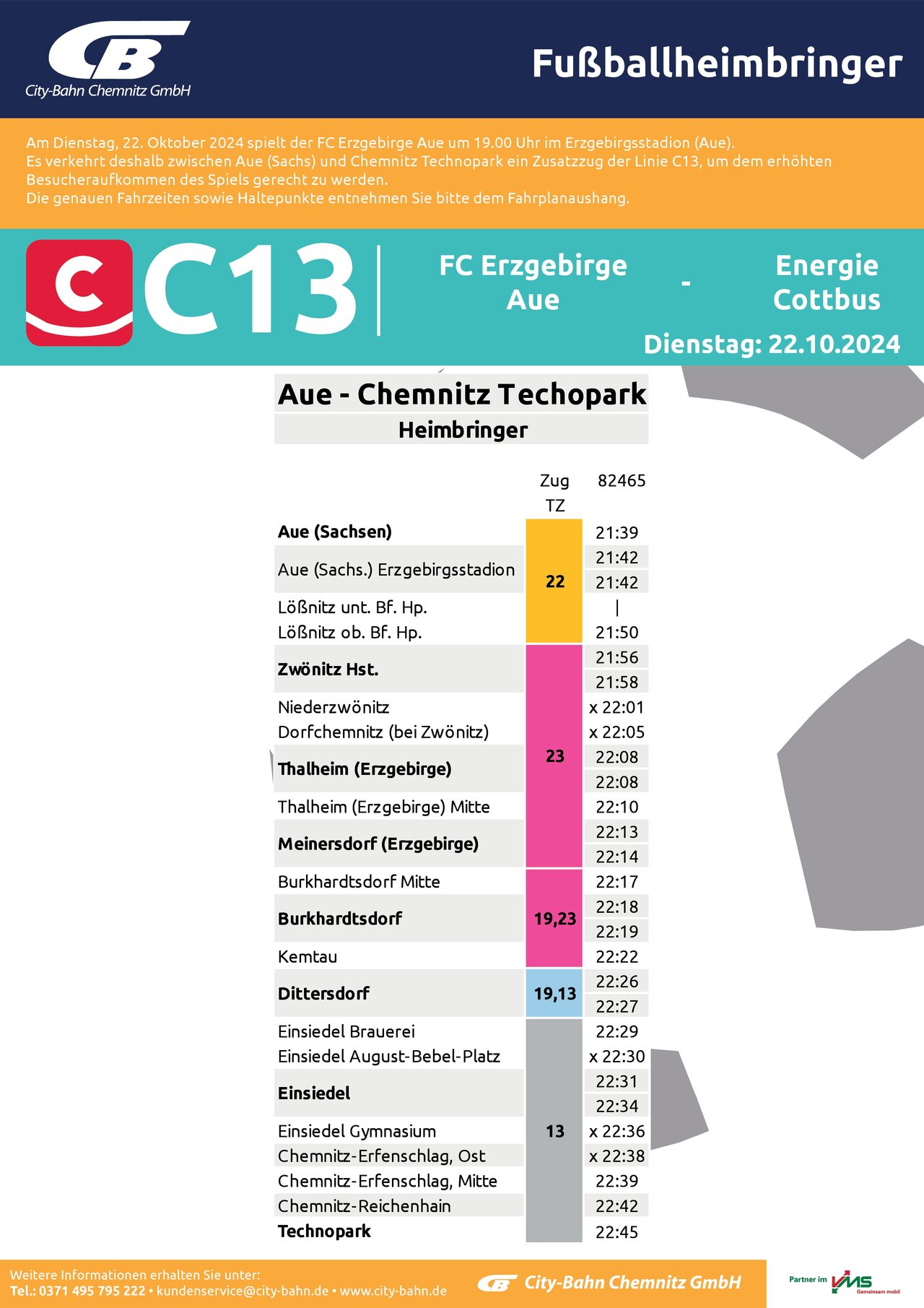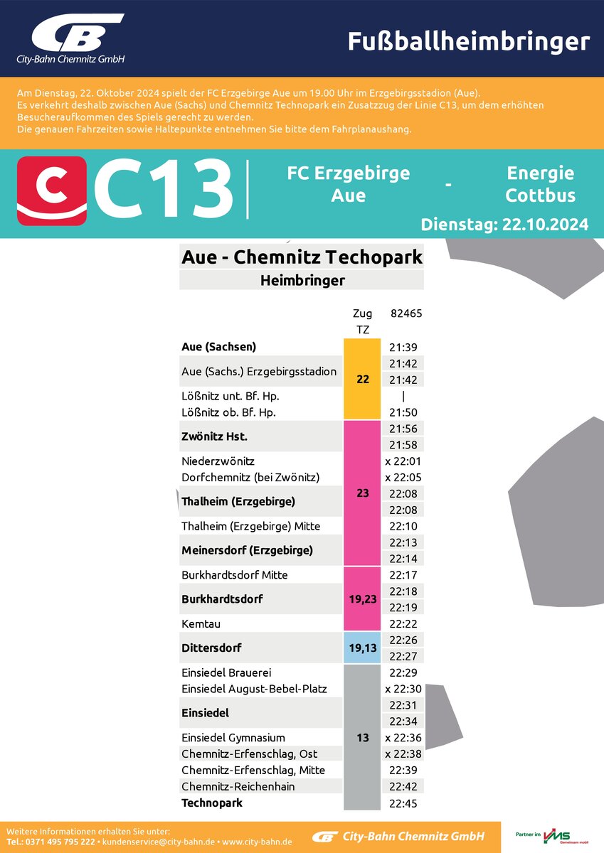 Zusätzlich zum Normalfahrplan verkehrt zwischen Aue (Sachs) <> Chemnitz Hbf ein Zusatzzug der Linie C13, um dem erhöhten Besucheraufkommen der Fußball-Begegnung FC Erzgebirge Aue – FC Energie Cottbus gerecht zu werden. Wir bitten anreisende Fans bei der Abreise nach Möglichkeit auf diese Verbindungen mit erhöhter Beförderungskapazität auszuweichen.