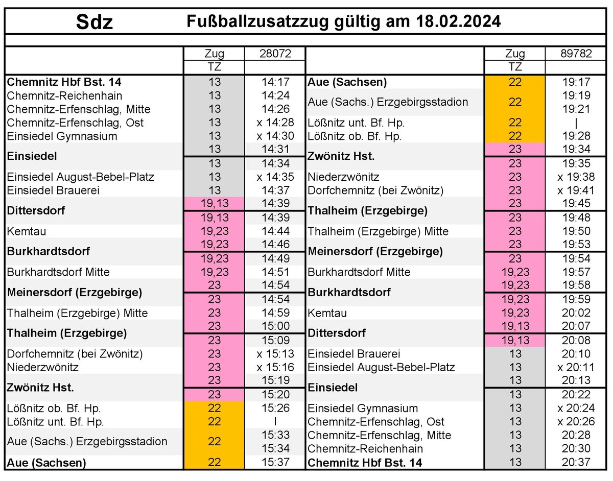 Zusätzlich zum Normalfahrplan verkehrt zwischen Aue (Sachs) <> Chemnitz Hbf ein Zusatzzug der Linie C13, um dem erhöhten Besucheraufkommen der Fußball-Drittligabegegnung FC Erzgebirge Aue – Dynamo Dresden gerecht zu werden. Wir bitten anreisende Heimfans bei der An- und Abreise nach Möglichkeit auf diese Verbindung mit erhöhter Beförderungskapazität auszuweichen.