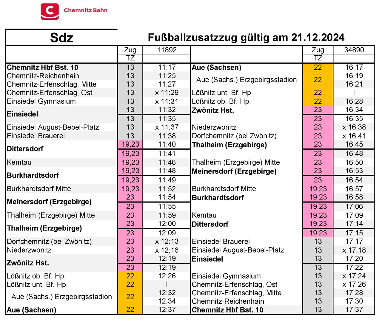 Zusätzlich zum Normalfahrplan verkehrt zwischen Aue (Sachs) <> Chemnitz Hbf ein Zusatzzug der Linie C13, um dem erhöhten Besucheraufkommen der Fußball-Drittligabegegnung FC Erzgebirge Aue – TSV 1860 München gerecht zu werden. Wir bitten anreisende Fans, bei der An- und Heimreise nach Möglichkeit auf diese Verbindungen mit erhöhter Beförderungskapazität auszuweichen.