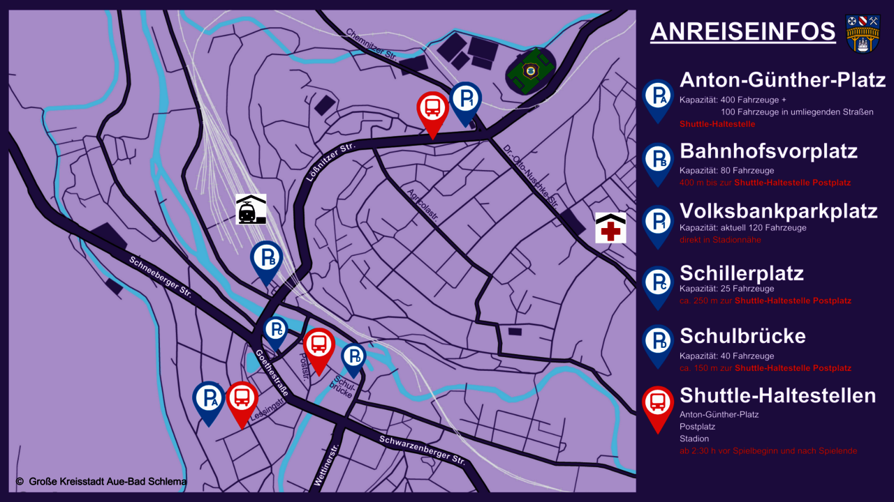 - Wir empfehlen die Nutzung der kostenfreien Parkplätze in der Innenstadt u.a. auf demAnton-Günther-Platz. Von dort fahren ab 11:30 Uhr kostenfreie Shuttle-Busse via Postplatz zum Stadion und nach Spielende zurück.
