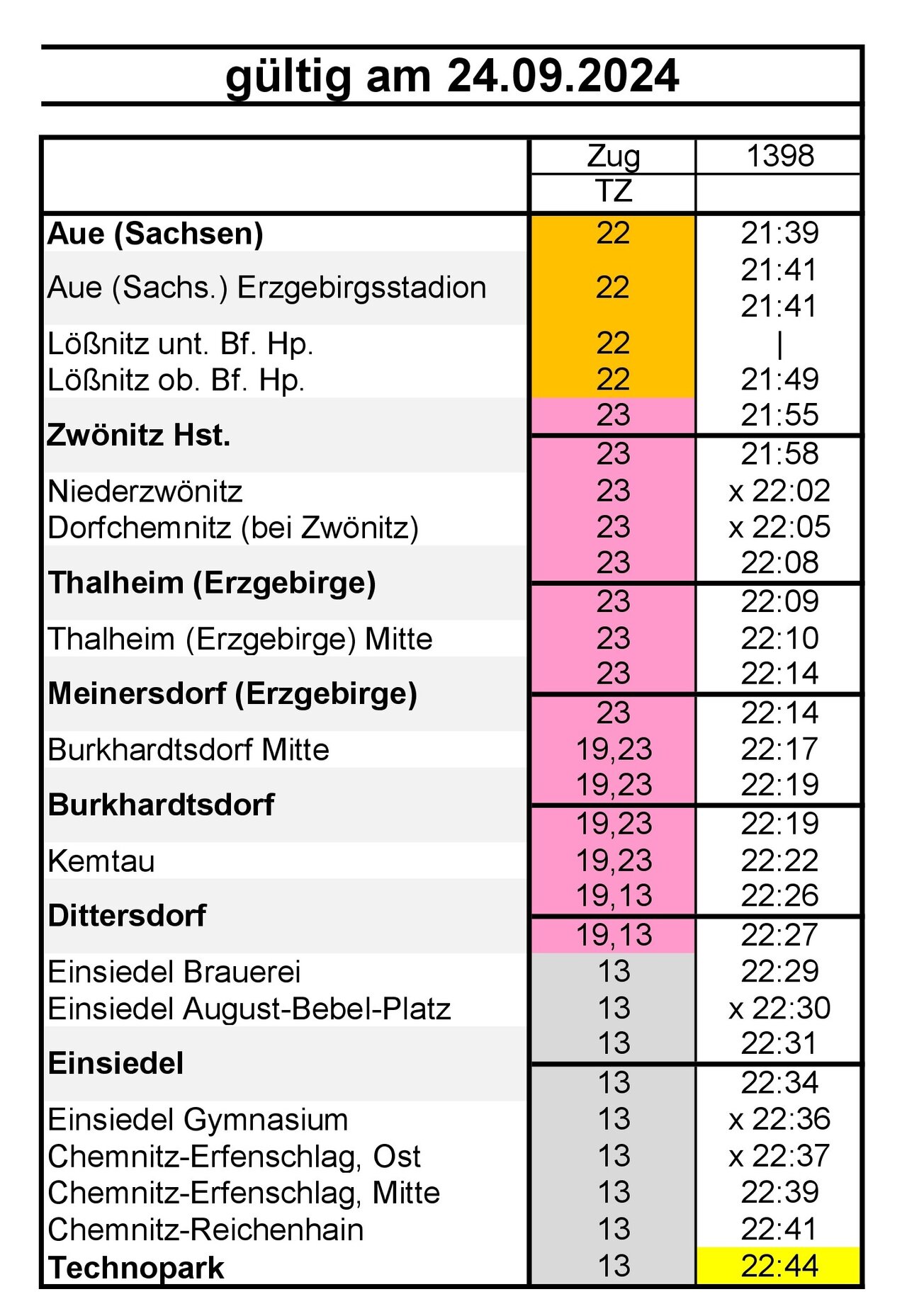 Zusätzlich zum Normalfahrplan verkehrt zwischen Aue (Sachs) <> Chemnitz Hbf ein Zusatzzug der Linie C13, um dem erhöhten Besucheraufkommen der Fußball-Drittligabegegnung FC Erzgebirge Aue – SV Wehen-Wiesbaden gerecht zu werden. Wir bitten anreisende Fans beider Mannschaften, bei der Heimreise nach Möglichkeit auf diese Verbindung mit erhöhter Beförderungskapazität auszuweichen.
