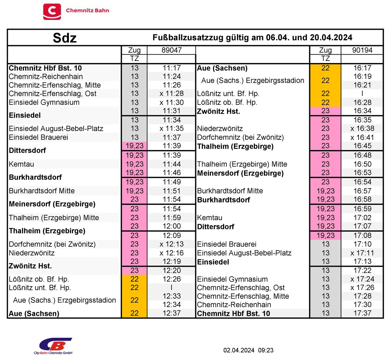 Zusätzlich zum Normalfahrplan verkehrt zwischen Aue (Sachs) <> Chemnitz Hbf ein Zusatzzug der Linie C13, um dem erhöhten Besucheraufkommen der Fußball-Drittligabegegnung FC Erzgebirge Aue – SpVgg Unterhaching gerecht zu werden. Wir bitten anreisende Fans beider Mannschaften, bei der An- und Heimreise nach Möglichkeit auf diese Verbindungen mit erhöhter Beförderungskapazität auszuweichen.