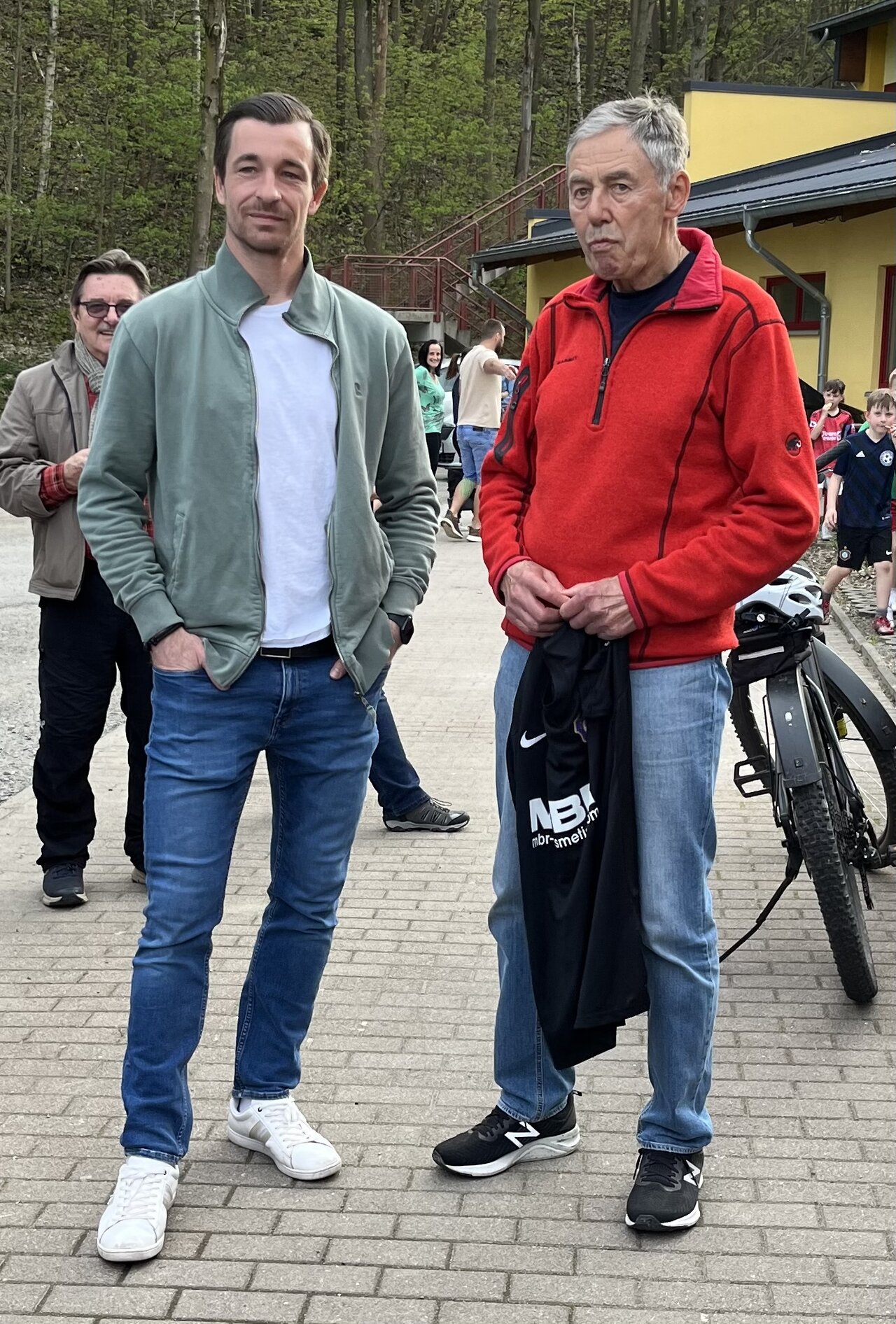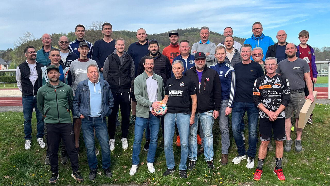 Natürlich hatten sich die beiden Strategen einiges zu erzählen. Fachsimpeln unter „Kollegen“. Denn der nunmehr 80-jährige Schwarzenberger steht immer noch zwischen den Pfosten, mit erstaunlichen Leistungen. Das bestätigen seine zumeist deutlich jüngeren Mitspieler respektvoll. Nach gemeinsamem Erinnerungsfoto bekam Martin als Dankeschön für seinen persönlichen Glückwunsch auch noch ein Präsent – ein „Männel“ aus dem Erzgebirge, macht Sinn.
