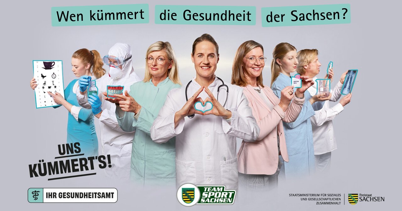 Das Sächsische Staatsministerium für Soziales und Gesellschaftlichen Zusammenhalt klärt unter dem Motto "Uns kümmert’s! – Ihr Gesundheitsamt" über die vielfältige Arbeit unserer Gesundheitsämter auf. Auch wir sind mit Team Sport Sachsen dabei und unterstützen die wichtige Kampagne.