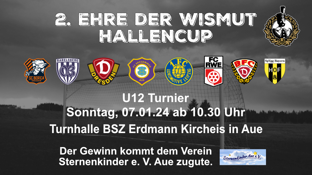 Das erste Januar-Wochenende 2024 steht ganz im Zeichen des talentierten Budenzaubers. Drei Hallenturniere verschiedener Altersklassen sind in Lößnitz und Aue geplant. Die U14 des FC Erzgebirge Aue hat hochkarätige Gegner zum ersten Gerd Schädlich-Gedenkturnier eingeladen. In der Nachbarschaft geht es um die „Ehre der Wismut“ zugunsten des Sternenkinder e.V. Aue.