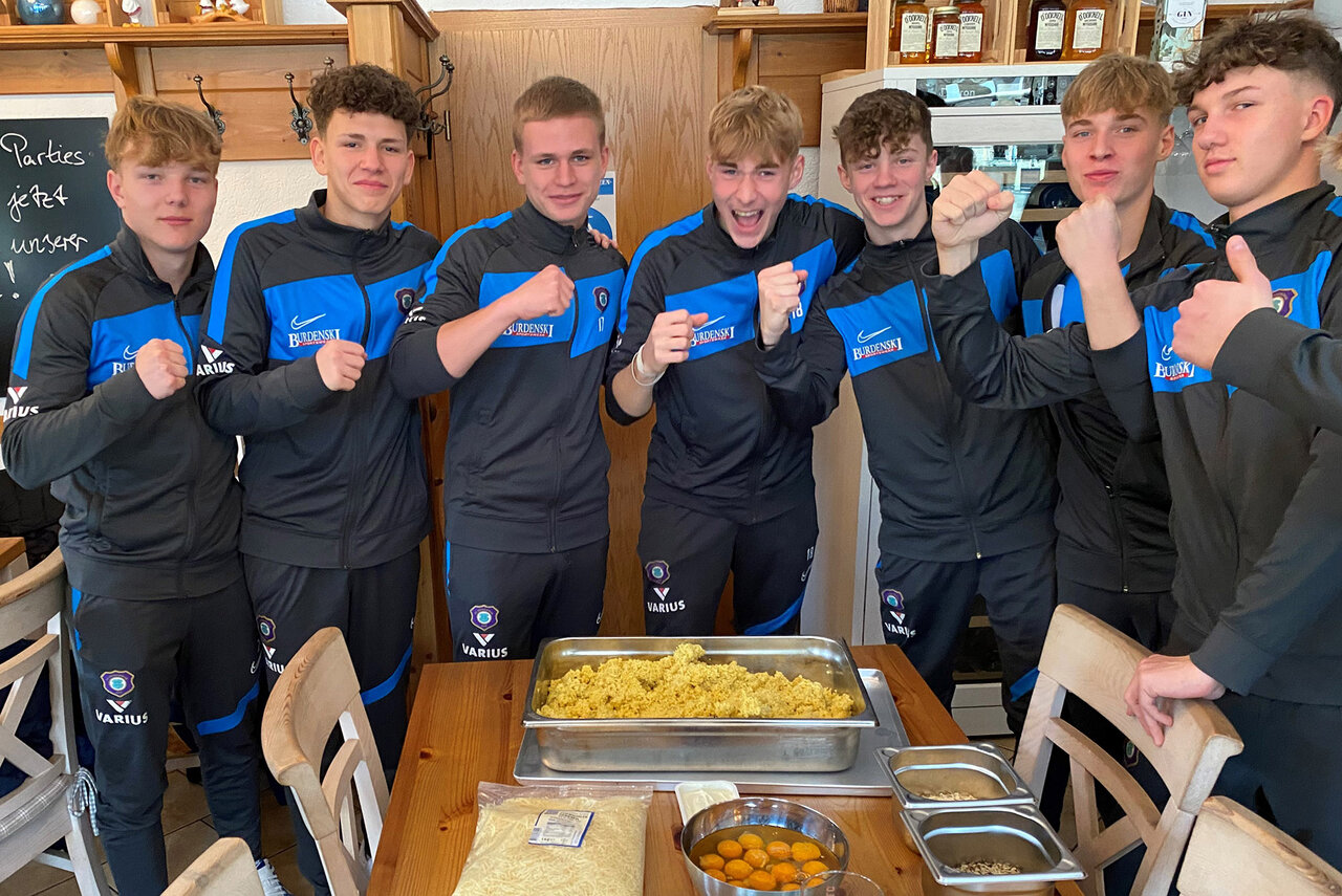 In den Ferien überlegten sich die Trainer der U17 noch einen echten Leckerbissen für die B-Junioren des FC Erzgebirge – im wahrsten Sinne des Wortes. Neben einer sehr durchgetakteten Trainingswoche mussten die Speicher wieder aufgefüllt werden. Also nutzte man am Donnerstagnachmittag die Gelegenheit, mit den Jungs nach Thalheim ins Tappas zu fahren, um dort lecker, gesund und ausgewogen zu kochen. In der Küche erwies sich der ein oder andere Spieler als echtes Talent. Sei es beim Zubereiten der Hirsebratlinge, der Smoothies, beim Braten oder Bestücken der Teller. Ralf und Annett gaben den Jungs viele Tipps für zu Hause, dem Internat oder Essen für die Schule mit an die Hand. Es war ein überaus gelungener Nachmittag. De U17 sagt DANKE!
