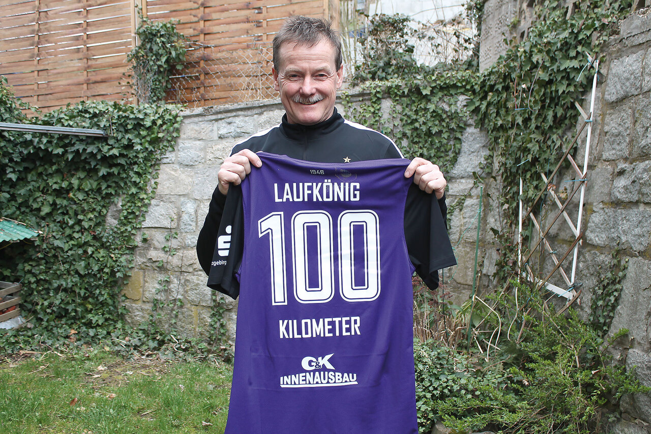 Die Einladung am 18. Februar in den VIP-Raum des Erzgebirgsstadions freute ihn sehr. Genauso wie der 2:1-Sieg seiner Veilchen an dem Sonntag über Dynamo Dresden. „Ebenso hatte ich zuvor getippt. Gipfel des Glücks war, dass mein Name beim Gewinnspiel des Förderkreises aus dem Lostopf gezogen wurde und ich ein FCE-Trikot gewann”, erzählt der bescheidene Extremsportler. Gleich darauf ließ er es im Fanshop beflocken mit seiner Paradestrecke und dem Spitznamen: „100 Kiometer – Lauf-König”. Das Dress hat daheim einen Ehrenplatz, neben seinen wichtigsten Medaillen und Pokalen. Einmal Aue – immer Aue!
