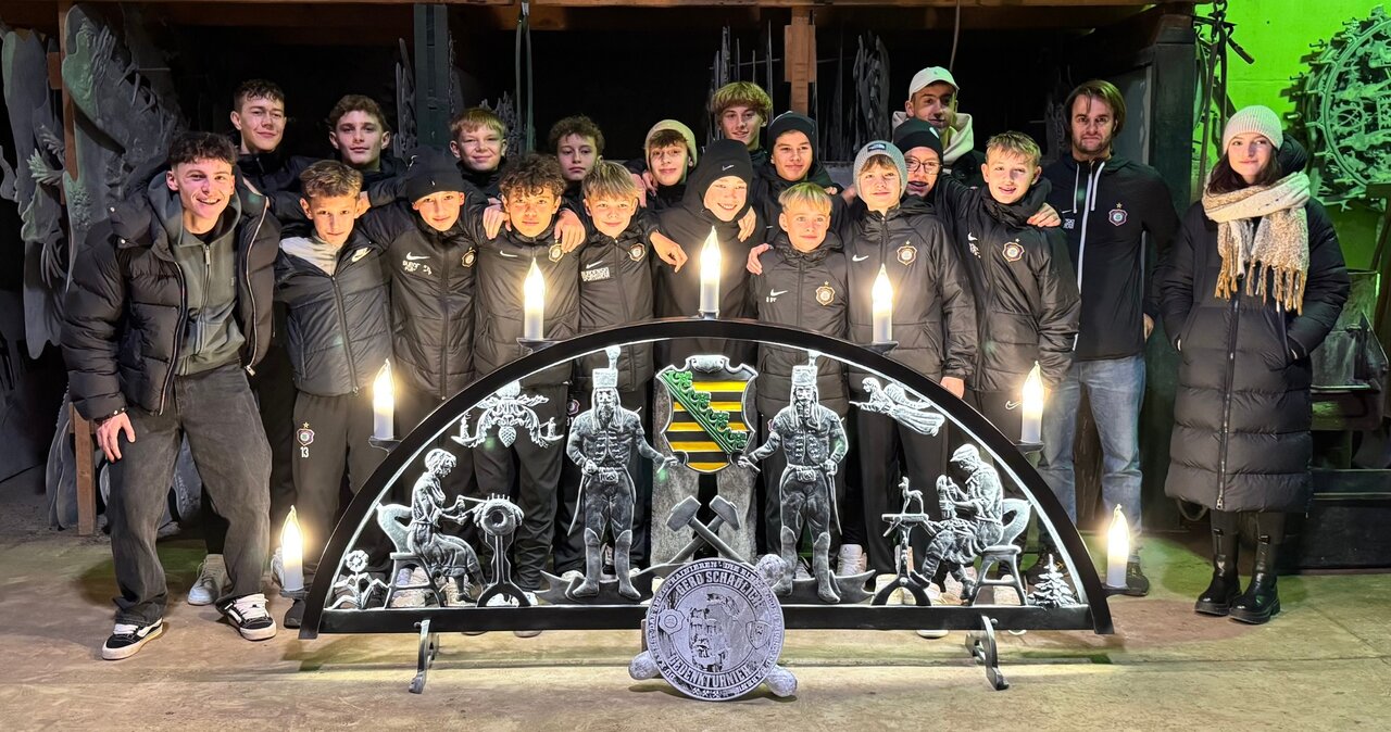 Aus der Profimannschaft ließen es sich die Youngster William Kallenbach und Tim Hoffmann nicht nehmen, die Gusskelle selbst in die Hand zu nehmen. Ein Erlebnis der besonderen Art, die mit einer Führung durch die Produktionshallen und der Vorstellung einzelner Arbeitsschritte bis zur Fertigstellung des Pokal-Unikats endete. Abschließend gab es heiße Getränke und ein Gruppenfoto der U14 hinter dem traditionellen Schwibbbogen mit Siegerpokal – als Ansporn, die Trophäe erneut zu gewinnen. Der Dank der Kumpelschmiede mit den vielen Talenten gebührt den Mitarbeitern von Kunstguss Döhler für den Einblick in die Handwerkskunst