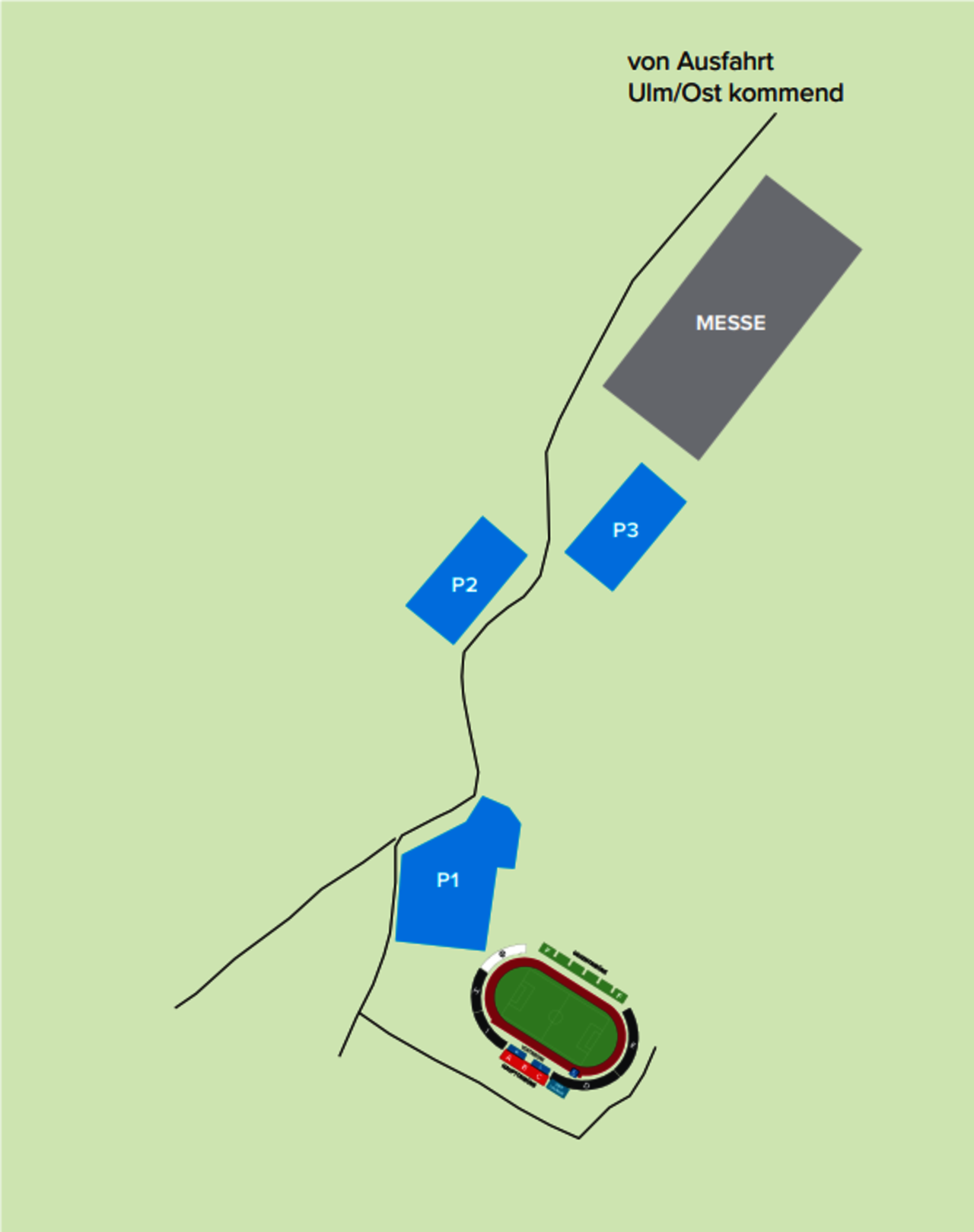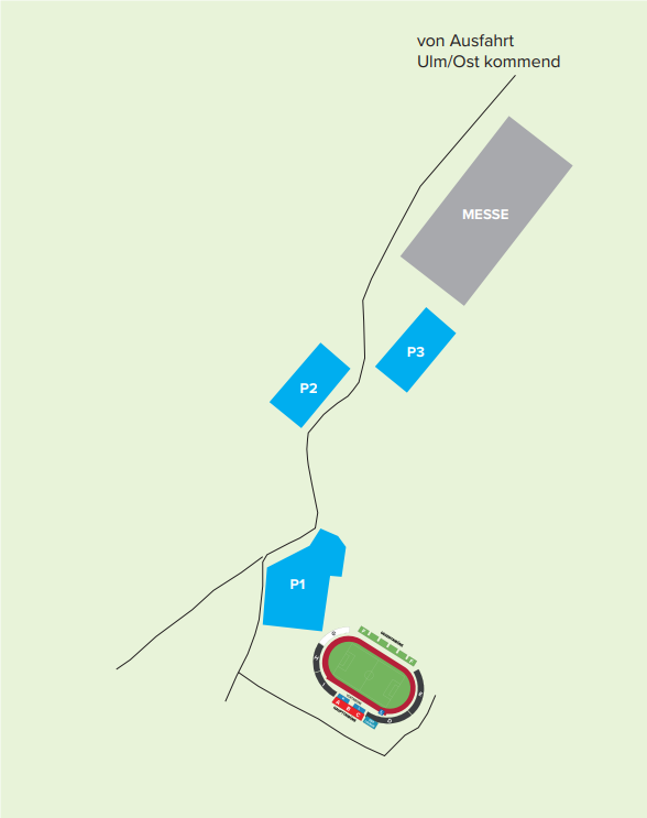 Von der A8 die Ausfahrt Ulm-Ost nehmen – der Beschilderung in Richtung Donaustadion/Messe folgen – den P1 nutzen (nur Gästefans)