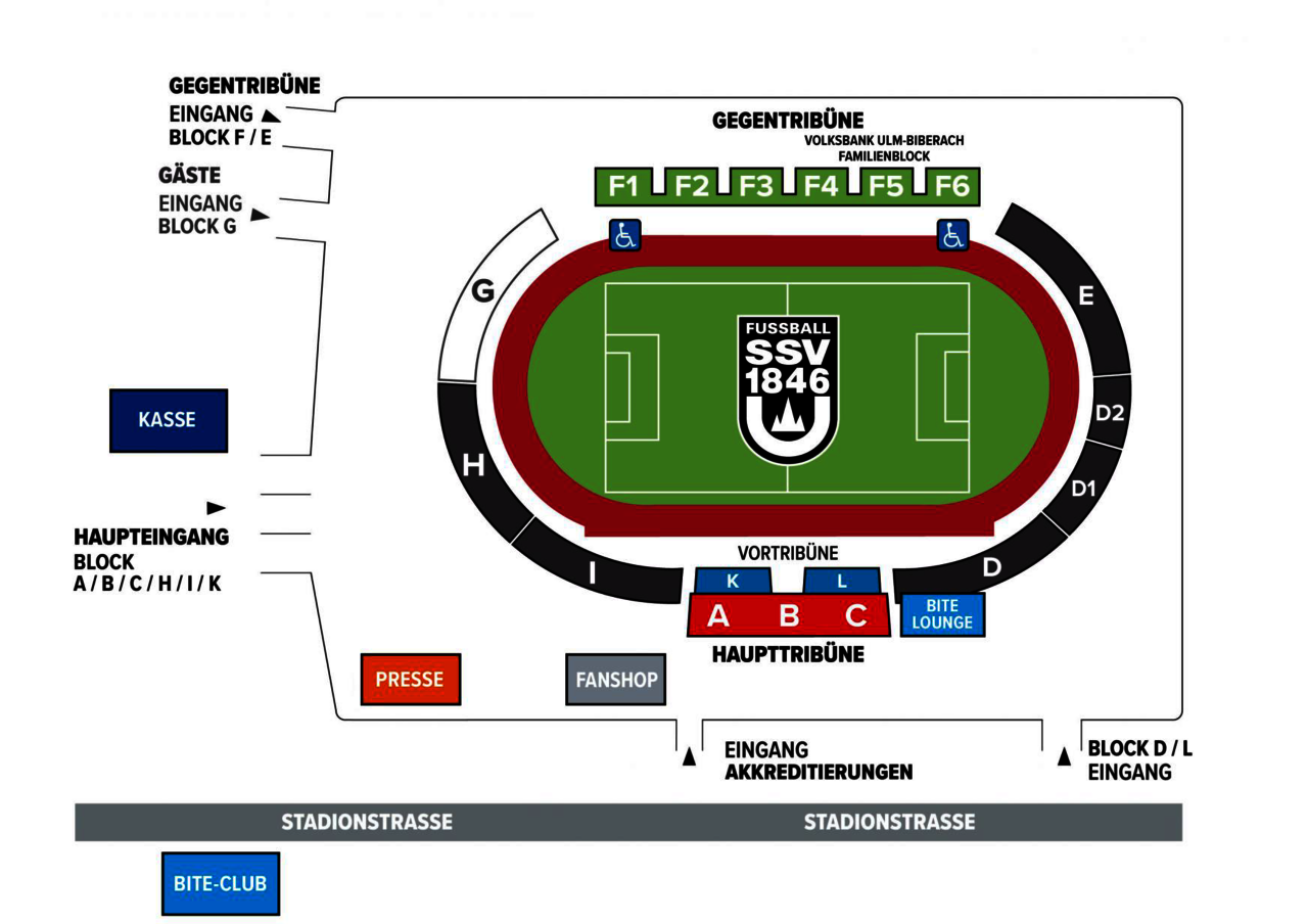 - Für eure Fans steht der Stehplatz Block G zur Verfügung, mit einer Kapazität von 2.200. Für Gäste die sitzen möchten, steht der Block F1 zur Verfügung mit 437 Sitzplätzen (Spielabhängig).
