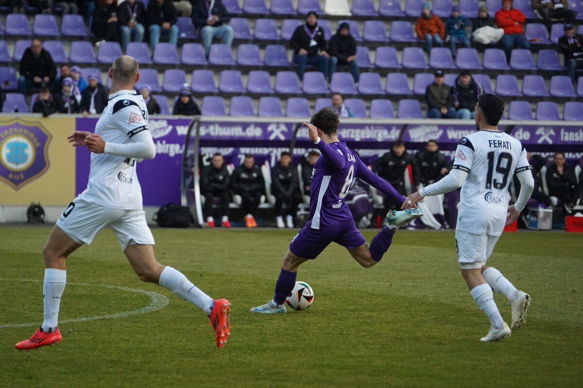 Gegen die abstiegsbedrohten Mannheimer von Cheftrainer Bernhard Trares wollten die Lila-Weißen zurück in die Erfolgsspur finden und die starke Heimbilanz seit der Winterpause im Erzgebirgsstadion verteidigen. Aber die Englische Woche hatte bei beiden Mannschaften sichtlich Körner gekostet. Wer zwanzig Minuten zu spät ins Stadion kam, hatte nichts verpasst. Beide Mannschaften standen tief und belauerten sich. Erst Mitte der ersten Hälfte nahm die Partie so langsam Fahrt auf und wieder einmal war es Mika Clausen, der das Auer Spiel ankurbelte. Der Mittelfeldspieler setzte sich bei einem Konter stark gegen seine Bewacher durch und hielt aus gut 20 Metern drauf. Jan-Christoph Bartels im Mannheimer Tor passte auf und musste auch eine Minute zur Stelle sein. Erneut war Clausen im Zentrum kaum zu stoppen gewesen und sein Heber in die Spitze kam perfekt auf Kilian Jakob. Aus spitzem Winkel musste der Linksfuß abziehen und fand im Schlussmann der Gäste seinen Meister. Nun war endlich Tempo im Spiel und auch der Waldhof kam zur ersten Torchance. Ex-Veilchen Arianit Ferati kam rechts im Strafraum an den Ball und versuchte den Ball frech ins lange Eck zu heben. Martin Männel war zur Stelle und fischte an seinem 37. Geburtstag die Kugel aus der gefährlichen Zone.