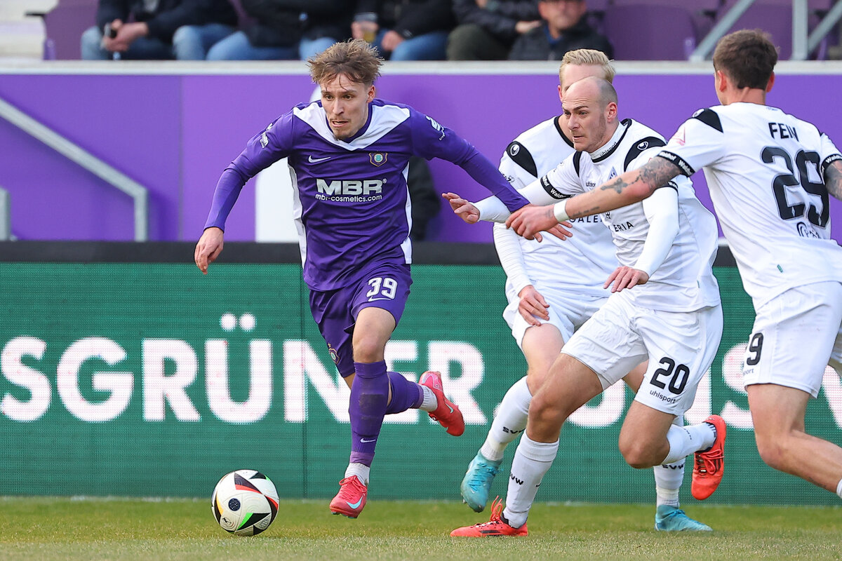 So schnell kann sich das Blatt in einer Englischen Woche drehen. Feierten die Veilchen am vergangenen Sonntag noch einen verdienten Heimsieg über Viktoria Köln, gab es unter der Woche eine bittere Niederlage im Rostocker Ostseestadion. Viel schwerer als die verlorenen Punkte wog jedoch der Ausfall von Top-Stürmer Marcel Bär. Die Auer Torgarantie zog sich eine schwere Achillessehnenverletzung zu und fällt damit die restliche Saison aus. Eine Hiobsbotschaft für das Auer Trainerteam um Jens Härtel, die die ohnehin schon angespannte Personalsituation im Lößnitztal weiter verschärft. Gegen den SV Waldhof Mannheim fehlten mit Marvin Stefaniak und Mirnes Pepic zwei weitere wichtige Stützen. Dafür rückten die gegen Hansa gesperrten Anthony Barylla und Steffen Nkansah zurück in die Startelf und im Sturm begannen Boris Tashchy und Maximilian Schmid.