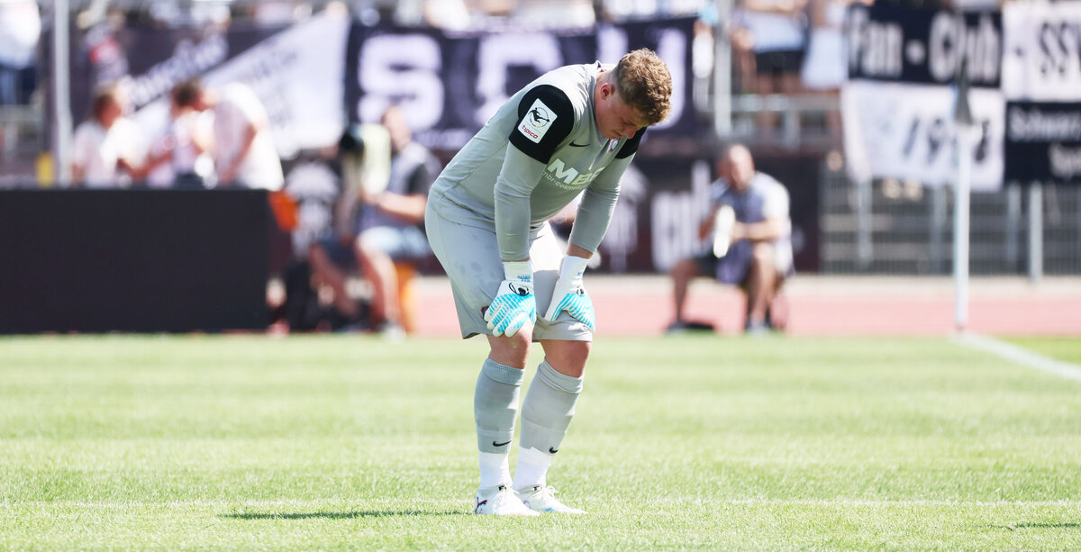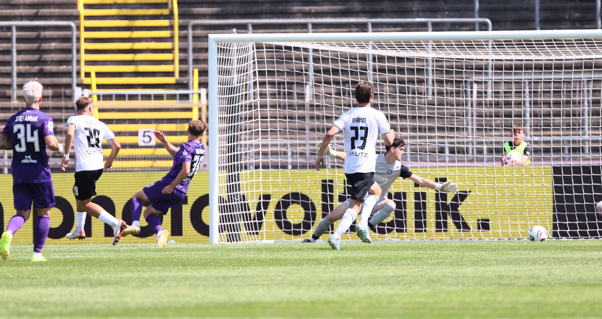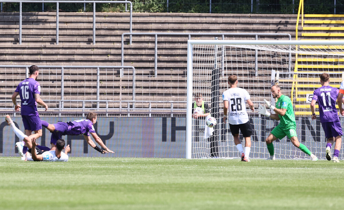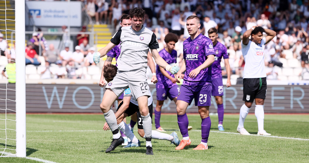 Aue lief weiter an, aber die Veilchen hatten dabei das Glück nicht auf ihrer Seite. Nach einem Schussversuch von Marvin Stefaniak scheiterten im Nachsetzen erst Julian Günther-Schmidt und dann Erik Weinhauer. Ulm verteidigte tief und verlegte sich die komplette zweite Hälfte auf ihr Konterspiel. In der 83. Minute verloren die Lila-Weißen einen Ball am gegnerischen Strafraum und Ulm rollte auf das Auer Tor zu. Torschütze Max Scholze behielt im Strafraum den Überblick, spielte seinen Auer Gegenspieler aus und legte den Ball quer auf Max Brandt. Das Stadion hatte den Torschrei schon auf den Lippen, aber mit einer Glanzparade kratzte Louis Lord den Ball von der Linie. Der Ersatzmann hielt Aue im wahrsten Sinne im Spiel, aber nach über 90 Minuten bei brütender Hitze hatten die Veilchen alle Körner auf dem Platz im Donaustadion gelassen. Mit den letzten Reserven kamen die Auer noch einmal spät in der Nachspielzeit vor das Tor. Aber die Chance von Erik Weinhauer war bezeichnend für die gesamte zweite Hälfte der Auer. Der Einwechselspieler setzte sich an der rechten Seite stark gegen zwei Gegenspieler durch und war frei durch. Die Nummer 7 schloss ab, aber der Ball rauschte am langen Eck vorbei. Ulm brachte die knappe Führung über die Zeit. Die Veilchen verlieren unglücklich bei den Spatzen mit 0:1.