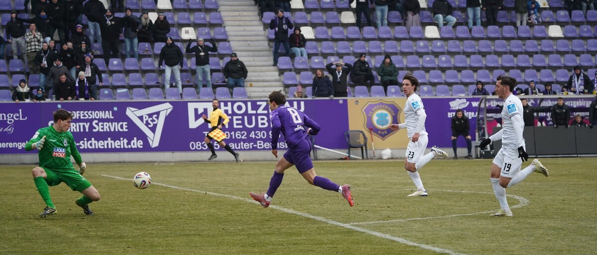 Im Kühlschrank des eins-Erzgebirgsstadion dauerte es einige Minuten, bis die Partie Fahrt aufnahm. Für den ersten Aufreger sorgte unfreiwillig Gäste-Keeper Max Schmitt. Weit aus seinem Tor herausgeeilt, musste der Schlussmann sehen, wie seine Vorderleute den Ball verspielten. Julian Günther-Schmidt bekam die Chance zum Torschuss. Aber noch bevor der Zehner der Auer schießen konnte, räumte Abwehrchef Marcel Seegert den Auer ab. Schiedsrichter Florian Lechner sah anscheinend keine Notbremse, aber nach dem harten Einsteigen ging es für Günther-Schmidt nicht mehr weiter. Boris Tashchy kam für ihn ins Spiel, wieder mussten die Veilchen eine Verletzung in der Anfangsphase verkraften. Aber die Auer verloren nicht den Faden. Direkt im Anschluss erspielten sich die Lila-Weißen die erste Chance. Pascal Fallmann eroberte einen abgefangenen Ball und legte gut auf Marcel Bär ab. Der Stürmer zog ab, aber im letzten Moment warf sich ein Ulmer dazwischen.