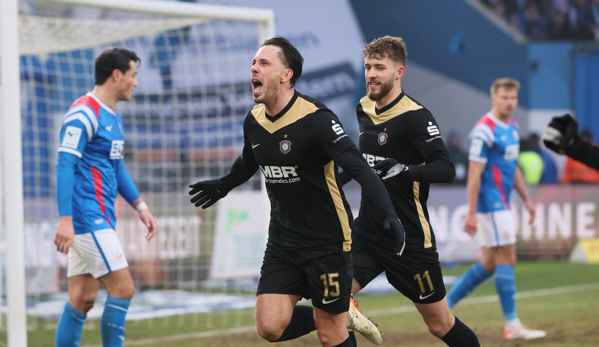 Es blieb spannend im Ostseestadion und beide Teams prüften, wer den längeren Atem hatte. Aue hielt mit allem dagegen und hielt die Angriffe Hansas immer wieder vor dem eigenen Strafraum auf. Jens Härtel brachte mit Maximilian Schmid und Boris Tashchy noch einmal neue Impulse. So ging es in die Schlussphase und Aue erarbeitete sich zwei weitere Ecken. Diese brachten aber nichts ein. Hansa konterte und schon Neidhart hatte den zweiten Treffer markieren können. Nach einer Ablage von Holten war der Außenverteidiger frei und jagte die Kugel scharf über die Latte. Aue kämpfte bis zum Schluss, aber Rostock entriss den Erzgebirgern den verdienten Lohn. In der allerletzten Minute der Nachspielzeit brachte Neidhart erneut einen Ball ins Zentrum. Diesmal konnte die Abwehr der Veilchen nicht klären und der fast verunglückte Abschluss von Ryan Naderi senkte sich über Lord hinweg ins Eck. 2:1 für Hansa Rostock – die Auer kassieren den späten Lucky Punch.