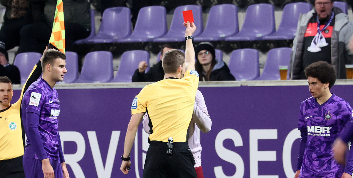 Nur nach Standards waren die Ingolstädter bislang gefährlich geworden und in der 31. Minute zappelte der Ball nach einem Freistoß im Auer Tor. Wieder war es Besuschkow, der das Spielgerät scharf gemacht hatte. Im Getümmel bekamen die Auer die Situation nicht entschärft und so staubte Frederik Carlsen ab und brachte den Ball im linken Eck unter. 0:1 – eine ganz bittere Pille für die Veilchen, denn den Schiedsrichtern war ein Handspiel eines Ingolstädters entgangen. Die Schanzer führten, aber dezimierten sich direkt nach dem Treffer. Julian Kügel räumte mit gestrecktem Bein und mit offener Sohle Ryan Malone weit vom Tor entfernt an der Seitenlinie ab. Schiedsrichter Simon Schreiner zögerte keine Sekunde und zeigte dem Übeltäter umgehend die Rote Karte. Jetzt waren die Veilchen gefordert und die Hausherren versuchten sofort, Druck aufzubauen und drängten auf den Ausgleich. Die dezimierten Schanzer zogen sich im Stile einer Handballmannschaft zurück und mauerten ihren Strafraum zu. Bis zum Pausenpfiff gelang es den Veilchen nicht, diese Abwehr zu durchbrechen.