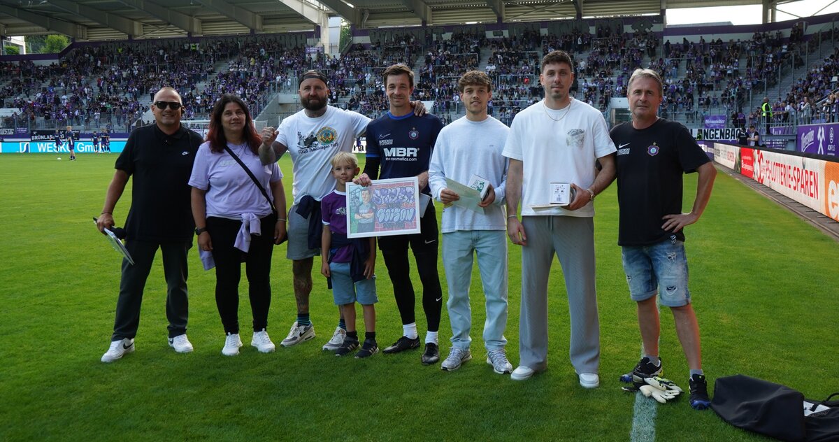 Das Auer Fanprojekt und die FCE-Fanbetreuung hatten nach Saisonende 2024/25 bereits zum 26. Mal gefragt, wer aus Sicht der Veilchen-Anhänger „Spieler der Saison“ in Lila-Weiß war. Knapp 1500 Stimmen wurden abgegeben, die Umfrage hat also durchaus repräsentativen Charakter. Torhüter und FCE-Rekordspieler Martin Männel hat nach seiner abermals sehr stabilen Saison die meisten Stimmen auf sich vereint, hatte mit 391 Stimmen und 27,7 Prozent deutlich die Nase vorn. Als Anerkennung für diese Wahl erhielt Martin Männel eine besondere Auszeichnung: eine eigens angefertigte Zeichnung des Graffitikünstlers Samuel Schelter aus Lößnitz. Auf den Podiumsplätzen folgten Mika Clausen (190 Stimmen) und Marcel Bär (151), der nur zwei Stimmen vor Marvin Stefaniak landete. Ein enges Rennen also. Die noch verletzten Mika Clausen und Marcel Bär freuten sich am Freitag im Stadion als Zuschauer über die Ehre und Wertschätzung durch die Fans. Alle drei erhielten neben einer Urkunde ein Raachermannl aus dem FCE-FanShop und zogen unter den Teilnehmern der Umfrage drei Gewinner. Diese werden im Laufe der Woche per E-Mail benachrichtigt.