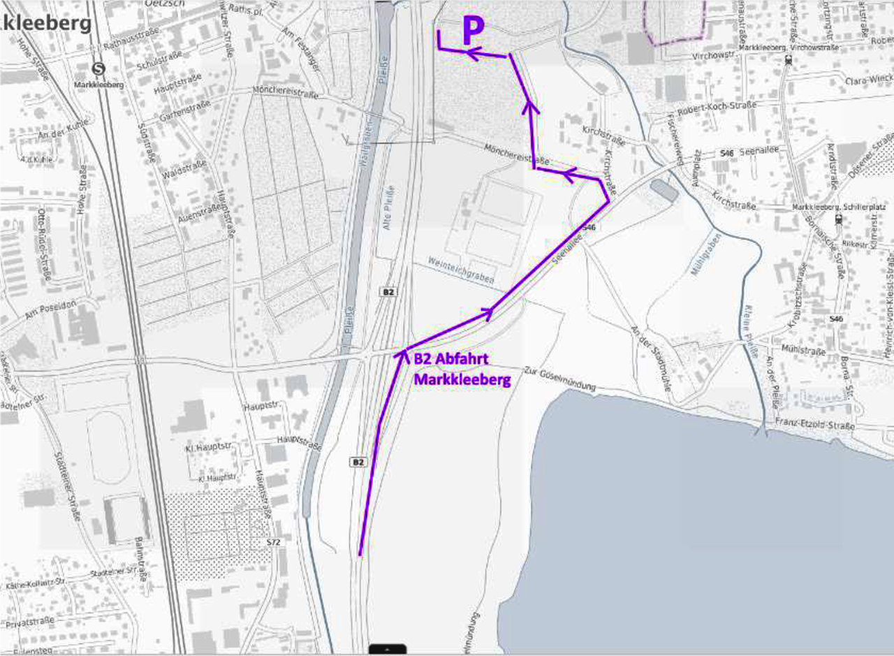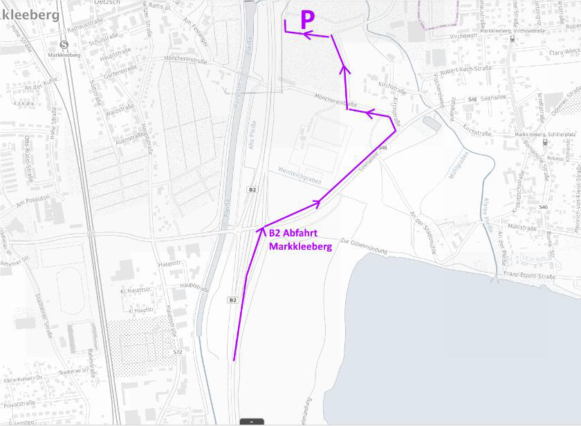 A72 – 2 Kilometer weiter auf B2 in Richtung Leipzig – Ausfahrt Richtung Markkleeberg – rechts abbiegen auf die Seenallee - nach 650 Metern links abbiegen auf die Kirchstraße – nach 70 Metern links abbiegen auf die Mönchereistraße – nach 170 Metern rechts abbiegen auf den Mönchereiparkplatz und nach weiteren 300 Metern links und 50 Meter später rechts zur Parkfläche