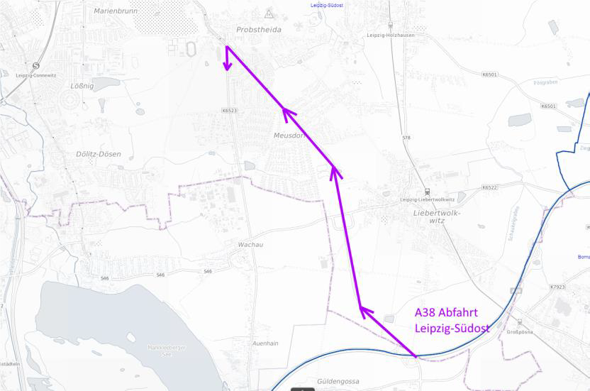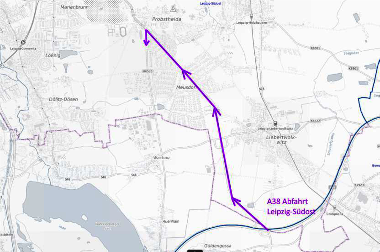 ➔ Anfahrt über A72 – auf A38, in Richtung Dresden, abbiegen – Ausfahrt Südost in Richtung Leipzig abfahren – links auf die Prager Straße in Richtung Leipzig abbiegen – nach ca. 6 Kilometern nach links in die Chemnitzer Straße einbiegen und nach 200 Metern anhalten und aussteigen