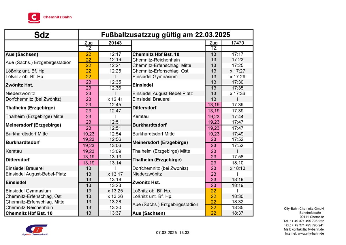 Bitte beachtet für die Rückreise, dass die Abfahrt um 17:17 Uhr vom Hauptbahnhof Chemnitz geplant ist. Bei einer Verlängerung der Spielzeit verschiebt sich die Abfahrt des Zuges, so dass eine Nutzung durch die Gästefans nach Aue sichergestellt ist.