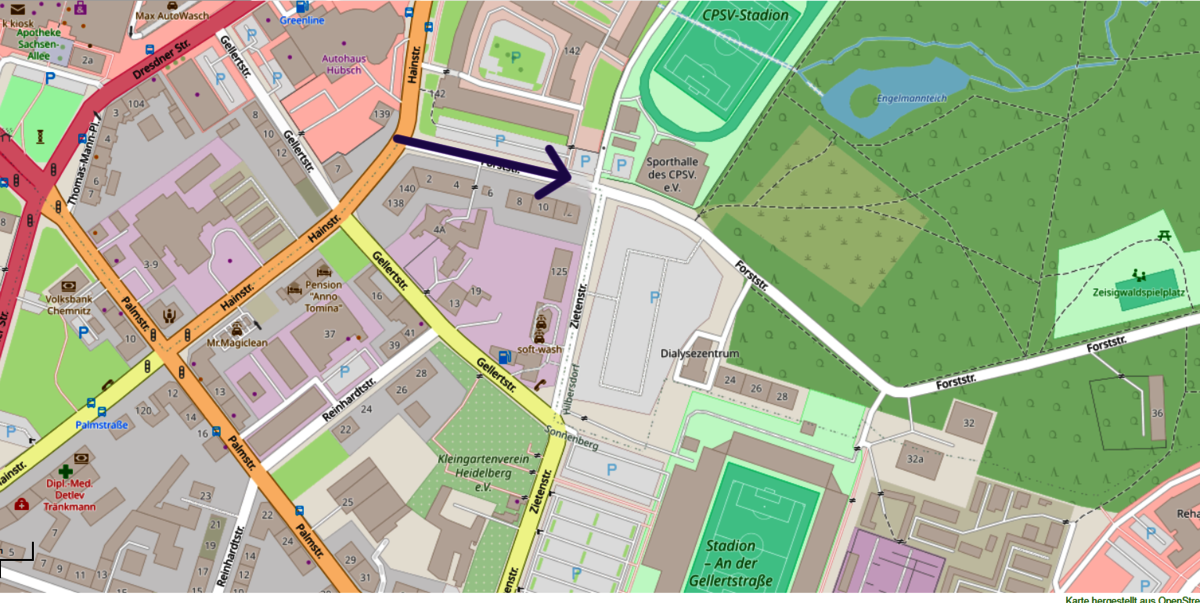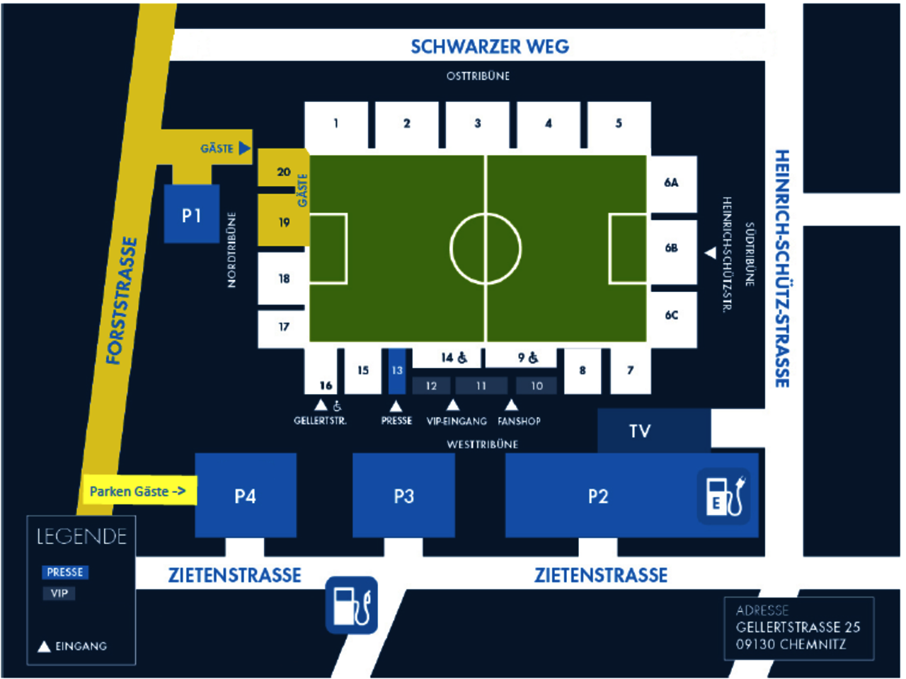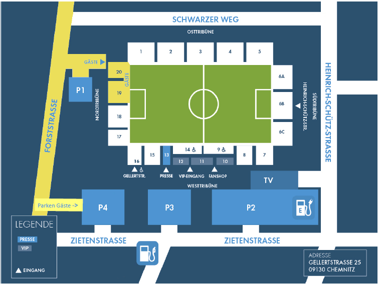 - Für PKWs und 9-Sitzer stehen folgende Parkplätze für Gästefans zur Verfügung: P4-Gast, CPSV (Chemnitzer Polizeisportverein) und Forststraße