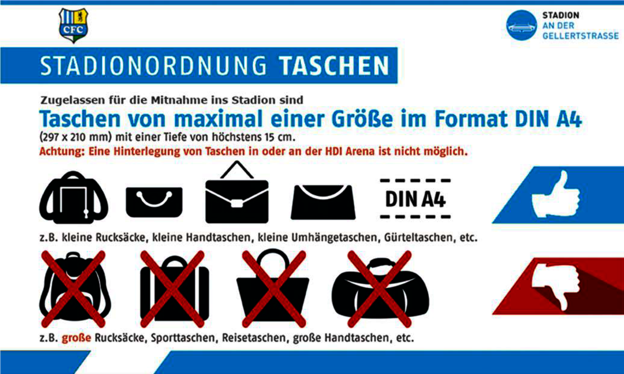 Es dürfen keine größeren Rucksäcke oder Taschen mit in das Stadion - An der Gellertstraße gebracht werden. Wer dergleichen mit sich führt, kann seinen Rucksack oder Tasche in eine Aufbewahrungsstelle direkt nach dem Einlass abgeben. Diese Möglichkeiten sind begrenzt, daher möchten wir euch bitten, nach Möglichkeit nicht benötigte Gepäckstücke in den Bussen oder PKWs zu lassen.