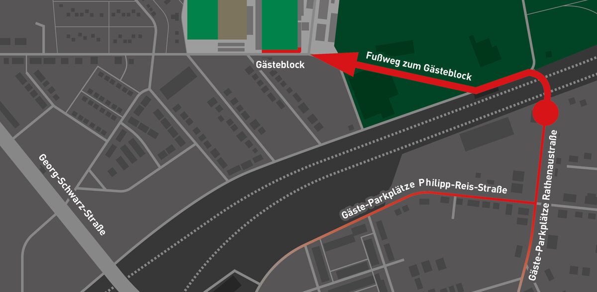 - Parken bitte ausschließlich in der Philipp-Reis-Straße (sowie angrenzenden Straßen). Dies sind die offiziellen Parkmöglichkeiten für Gästefans. Von dort aus sind es 10 Minuten zum Gästeblock (Siehe Skizze). Die Polizei bestreift die Parkmöglichkeiten.