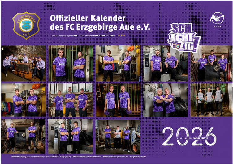In zehn Wochen ist das Jahr 2025 schon wieder vorbei. Höchste Zeit, sich auf 2026 vorzubereiten. Die Kalender für das Jubiläumsjahr des FC Erzgebirge Aue sind nämlich schon da und ab sofort erhältlich. Mit Motiven aus dem Schacht.