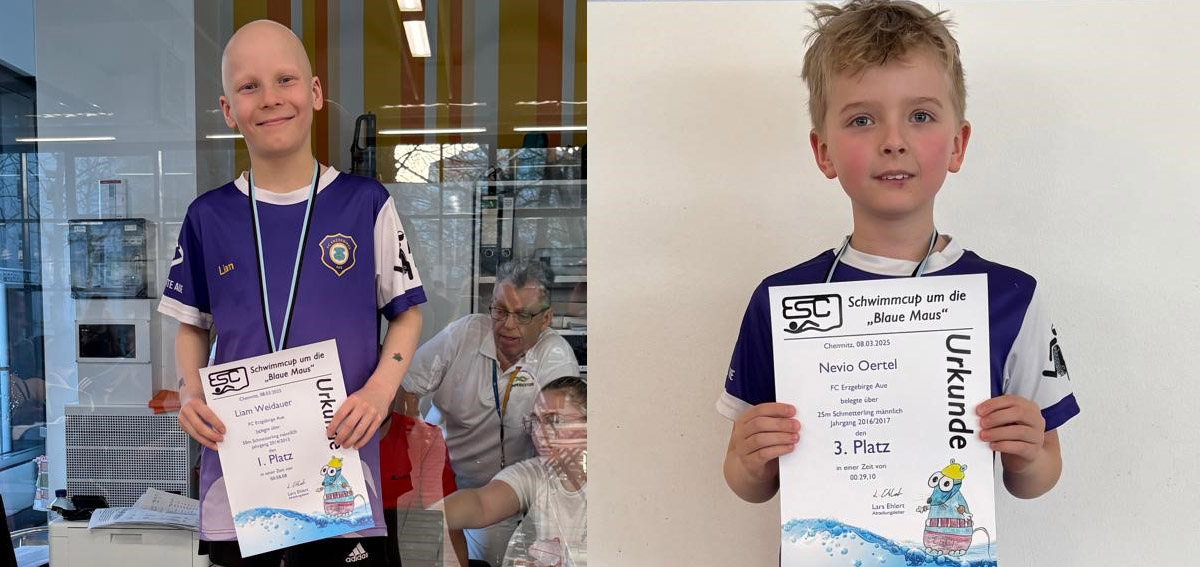 Auch Klara Liedtke bewies ihr Können und machte als echtes Brusttalent auf sich aufmerksam. Über 25 m und 50 m Brust sicherte sie sich jeweils Bronze und verbesserte dabei ihre persönlichen Bestzeiten deutlich. „Was für eine tolle Leistung!“, freute sich ihre Trainerin. Auch Wiebke Ullmann zeigte, dass ihre Formkurve nach oben zeigt. So schwamm sie über die 25 m Rücken eine Kaderzeit des Sächsischen Schwimmverbandes, wurde aber aufgrund eines Frühstarts disqualifiziert. Dennoch zeigte sie – wie das gesamte Team – beachtliche Fortschritte. Auch Nevio Oertel (Bronze über 25 m Schmetterling) und Liam Weidauer (Gold über 50 m Schmetterling) trugen zur erfolgreichen Medaillenbilanz des FC Erzgebirge Aue bei.