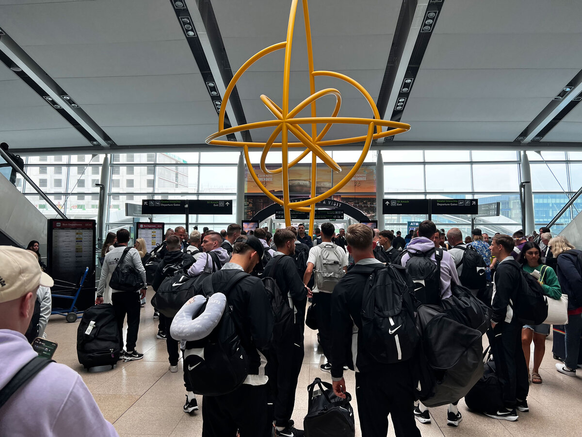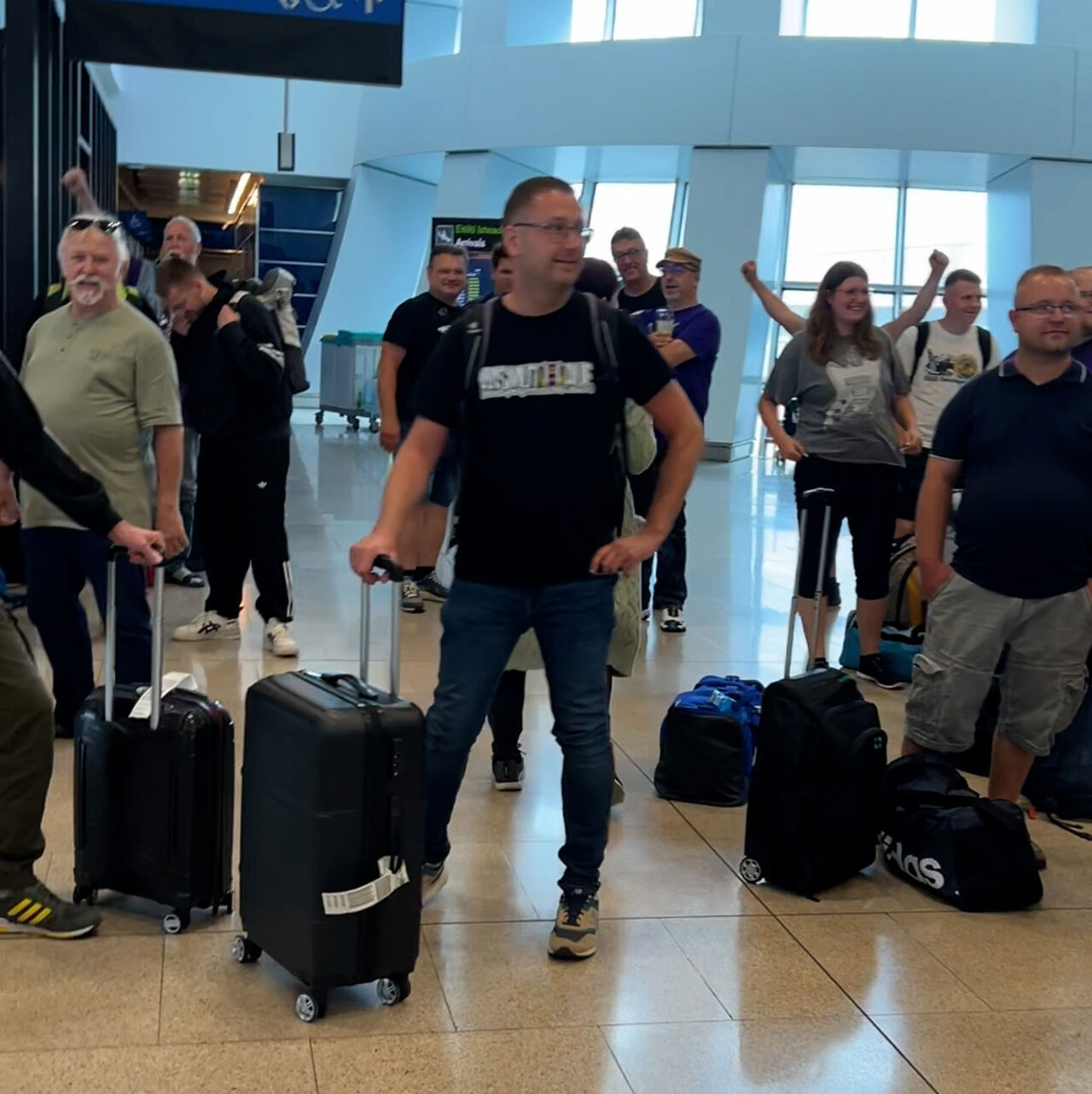 Kurz nach 13 Uhr Ortszeit setzte unser Flieger auf irischem Boden auf. Am Gepäckband hieß es noch kurz warten, doch dann wurden wir im Ankunftsbereich direkt musikalisch von einigen Aue-Fans begrüßt – ein gelungener Empfang!