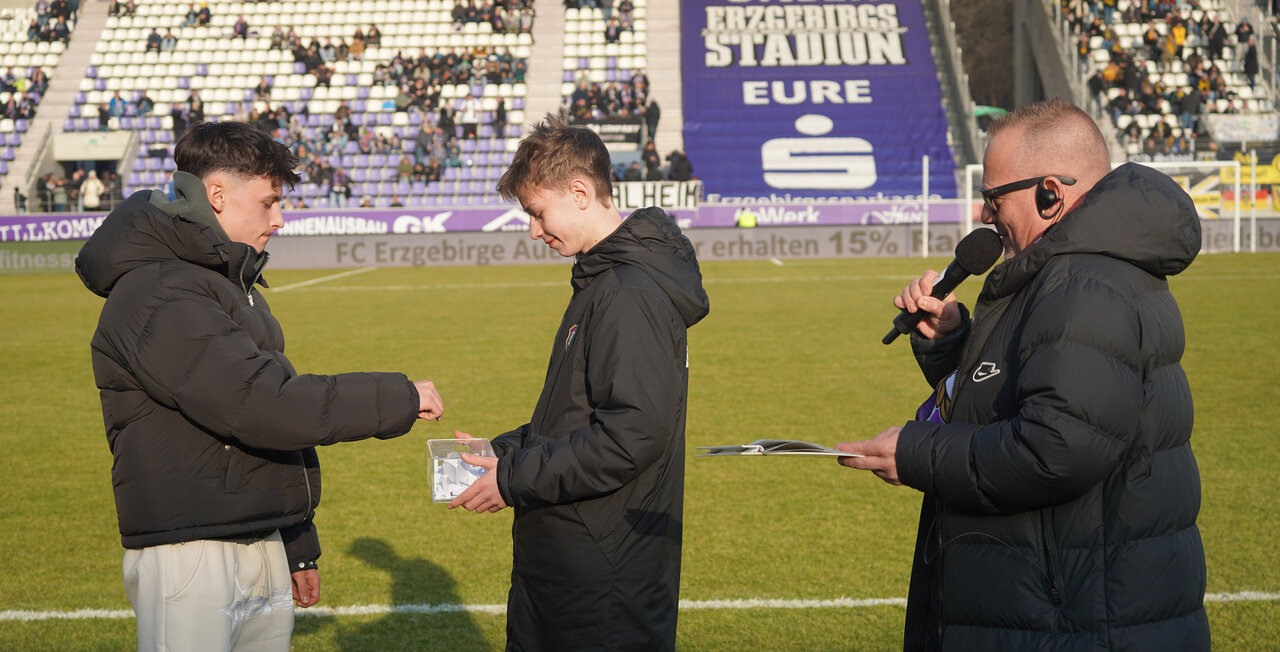 Jung-Profi William Kallenbach als Eigengewächs der Porsche-Kumpelschmiede fungierte samt Nachwuchsspieler und Balljungen als „Glücksfee“. Der SSV Fortschritt Lichtenstein, die Förderschule Oelsnitz, Blau-Gelb Mülsen, der FC Greifenstein 04 und die Kita „Haus für Kinder“ in Zschorlau wurden aus dem prall gefüllten Lostopf gezogen und sind schriftlich über den Gewinn informiert. Zum nächsten Heimspiel gegen Unterhaching am 22. Februar erwartet der FCE folglich 100 Gäste aus der Nachbarschaft und überreicht im Vorfeld die ausgelobten Freikarten.