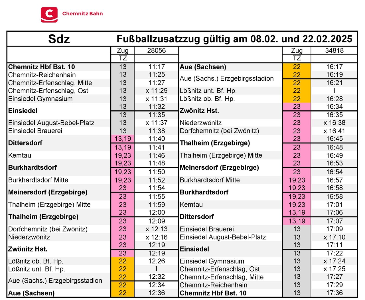 Zusätzlich zum Normalfahrplan verkehrt zwischen Aue (Sachs) <> Chemnitz Hbf ein Zusatzzug der Linie C13, um dem erhöhten Besucheraufkommen der Fußball-Drittligabegegnung FC Erzgebirge Aue – Alemannia Aachen gerecht zu werden. Wir bitten anreisende Fans, bei der An- und Heimreise nach Möglichkeit auf diese Verbindungen mit erhöhter Beförderungskapazität auszuweichen.