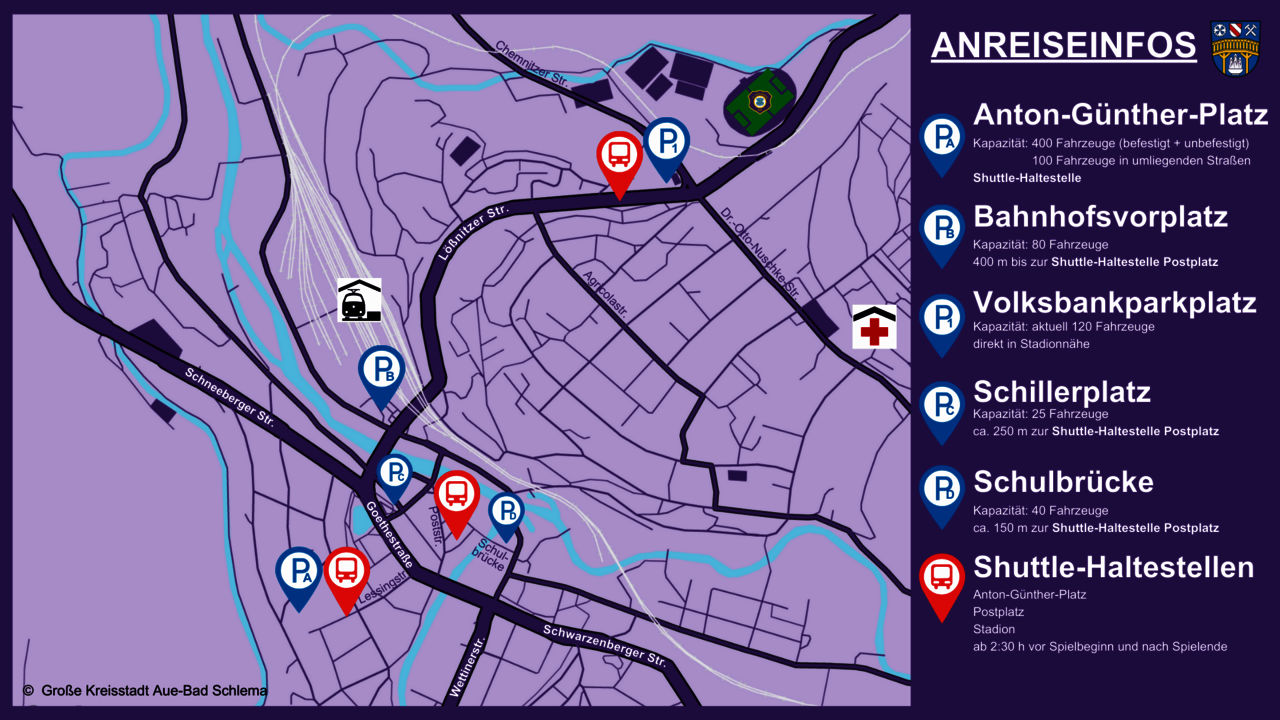 - Wir empfehlen die Nutzung der kostenfreien Parkplätze in der Innenstadt u.a. auf dem Anton-Günther-Platz. Von dort fahren ab 11:30 Uhr kostenfreie Shuttle-Busse via Postplatz zum Stadion und nach Spielende zurück.